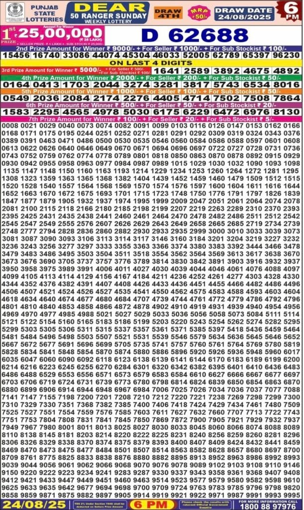 Punjab State Dear 50 Ranger Sunday 6pm Lottery Result 24.08.2025 0 Likes 70 Views Related Articles 0 46Dear 2000 monthly lottery 08.11.2025 result 7pm 0 76Punjab State Dear 50 Beast Monday 6pm Lottery Result 08.09.2025 1 167Sikkim state dear ganesh chaturthi bumper lottery 20.9.2025 at 8pm 0 50Maharashtra Gajlaxmi Budh Weekly Draw 12.11.2025 Result 4.45pm