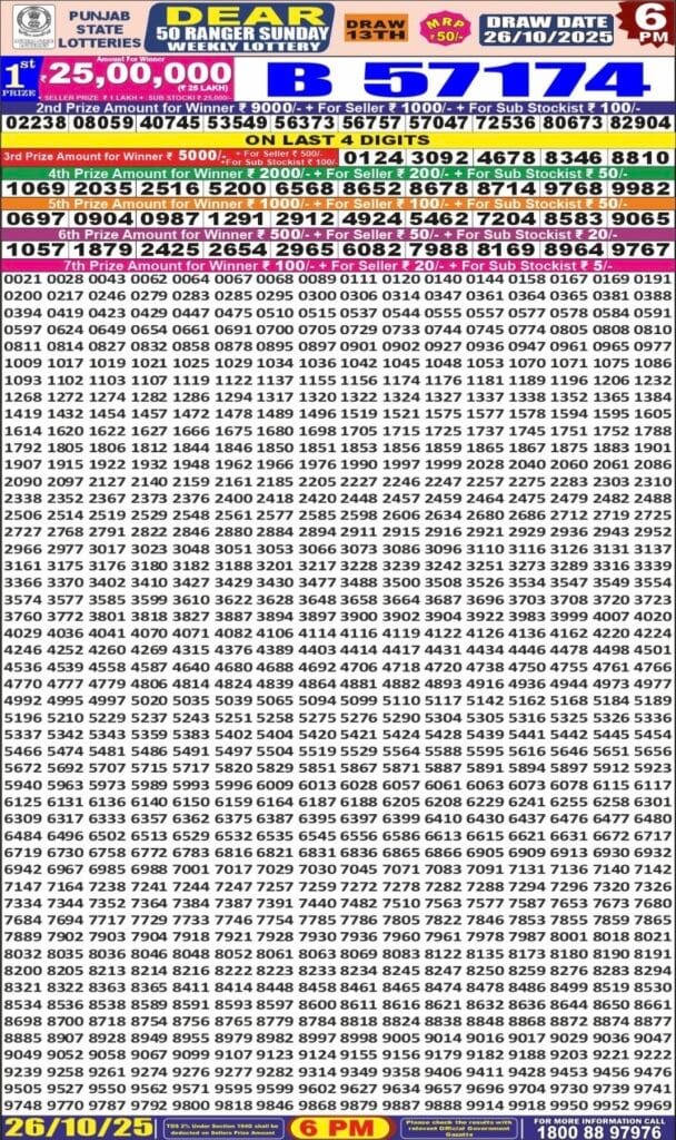 Punjab State Dear 50 Ranger Sunday 6pm Lottery Result 26.10.2025 0 Likes 48 Views Related Articles 0 55Dear blitzen monday weekly 6PM Result 21.07.2025 0 33Maharashtra Sahyadri Dhanlaxmi Weekly Draw 08.12.2025 Result 4.30pm 0 58Maharashtra Ganeshlaxmi Samruddhi Weekly Draw 25.10.2025 Result 5pm 0 67Maharashtra Ganeshlaxmi Shubh Weekly Draw 11.11.2025 Result 5pm