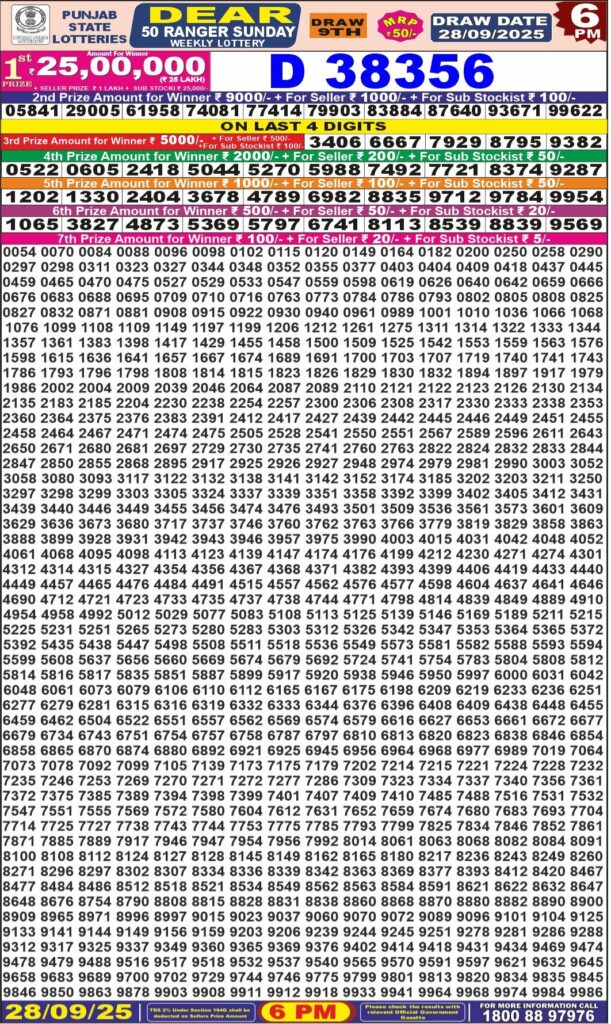 Punjab State Dear 50 Ranger Sunday 6pm Lottery Result 28.09.2025 0 Likes 98 Views Related Articles 2 97Punjab State Dear 50 Colt Friday 6pm Lottery Result 31.10.2025 0 31Punjab State Dear 20 Monthly Lottery 23.12.2025 Result 7 PM 0 47Maharashtra Sahyadri Prabhalaxmi Weekly Draw 29.11.2025 Result 4.30pm 0 57Maharashtra Ganeshlaxmi Shubh Weekly Draw 28.10.2025 Result 5pm