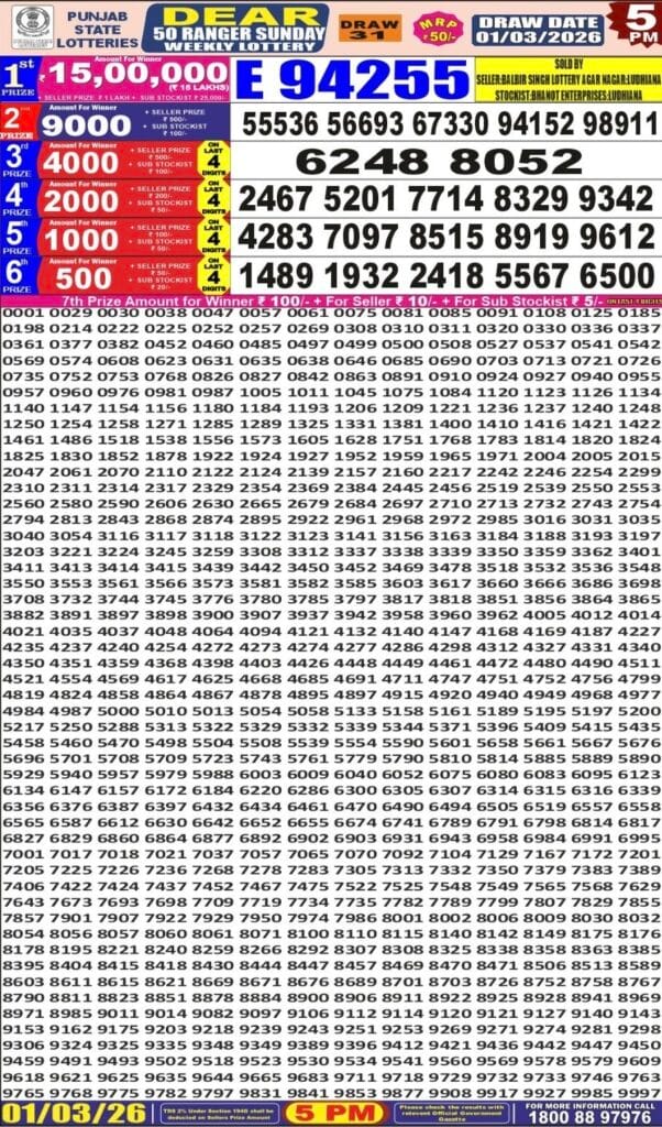 Punjab State Dear 50 Ranger Sunday Weekly Lottery 01.03.2026 Result 5 PM