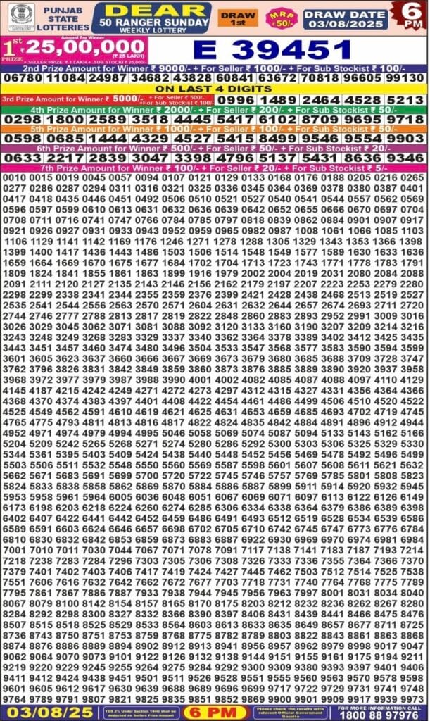 Punjab state dear 50 Ranger Sunday weekly lottery 3.8.2025 Result 6pm 0 Likes 82 Views Related Articles 0 59Maharashtra Ganeshlaxmi Vaibhav Weekly Draw 02.11.2025 Result 5pm 0 56Maharashtra Ganeshlaxmi Samruddhi Weekly Draw 06.12.2025 Result 5pm 0 31Punjab State Dear 20 Monthly Lottery 23.12.2025 Result 7 PM 0 59Punjab state dear 20 monthly lottery 22 July 2025 At 6 PM