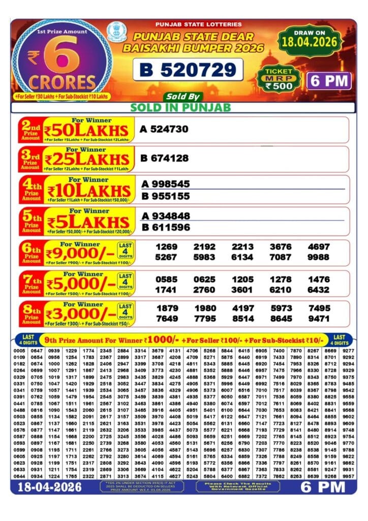 Punjab State Dear Baisakhi Bumper 2026 Result 0 Likes 22 Views Related Articles 0 99Maharashtra Ganeshlaxmi Samruddhi Weekly Draw 10.01.2026 Result 5pm 0 154Maharashtra Gajlaxmi Ravi Weekly Draw 30.11.2025 Result 4.45pm 3 99Rajshree 250 monthly lottery 3.3.2026 at 6.30pm 0 42Punjab state dear 200 monthly lottery 4 April 2026 at 6pm