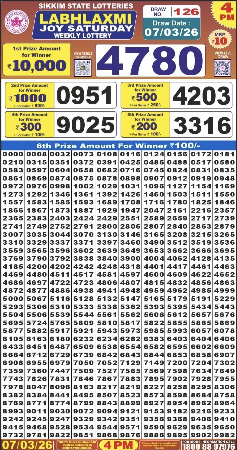 Rajshree 10 Evening Budh Weekly Lottery 04.03.2026 Result 5.40 PM 0 Likes 60 Views Related Articles 1 100Maharashtra Gajlaxmi Som Weekly Draw 05.01.2026 Result 4.45 PM 0 82Maharashtra Gajlaxmi Shani Weekly Draw 28.02.2026 Result 4.45 PM 0 54Nagaland State Dear Mahashivratri Bumper Lottery 21 Febraury 2026 At 6 PM 0 39Sikkim State Labhlaxmi Joy Saturday Weekly Lottery 07.03.2026 Result 4 PM