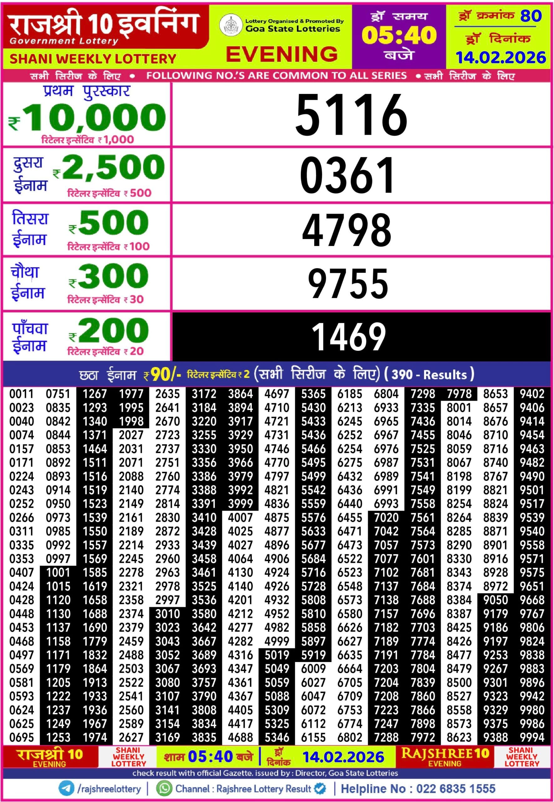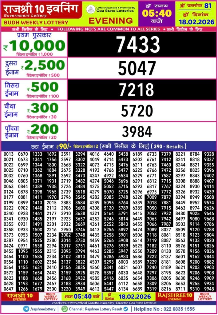 Rajshree 10 Evening Budh Weekly Lottery 18.2.2026 Result 5.40 PM 0 Likes 27 Views Related Articles 0 61Maharashtra Ganeshlaxmi Dhan Weekly Draw 06.02.2026 Result 5pm 0 47Punjab State Dear 50 Jackal Saturday 6pm Lottery Result 10.01.2026 1 84Golden Star Shukra Weekly Lottery 02.01.2026 Result 9 PM 0 82Punjab State Dear 50 Bronco Tuesday 6pm Lottery Result 16.12.2025