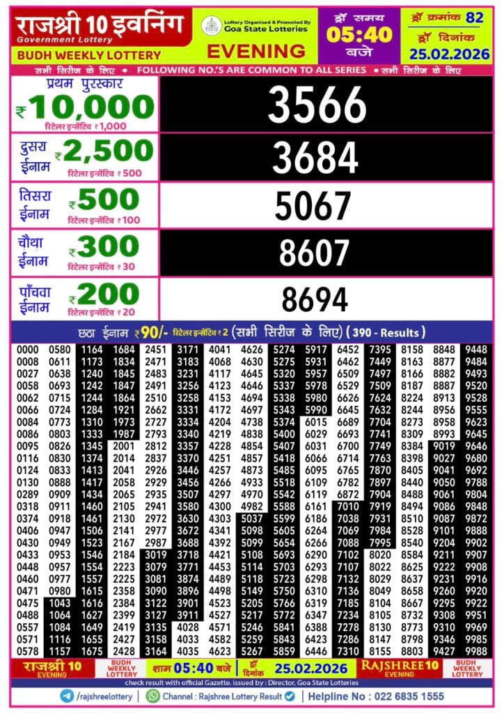 Rajshree 10 Evening Budh Weekly Lottery 25.2.2026 Result 5.40 PM 0 Likes 48 Views Related Articles 0 89Punjab State Dear 100 Monthly Lottery 10.2.2026 Result 7 PM 0 80Maharashtra Ganeshlaxmi Vijayee Weekly Draw Result 14.01.2026 Result 5pm 0 96Maharashtra Gajlaxmi Shani Weekly Draw 10.01.2026 Result 4.45 PM 0 119Maharashtra Padmini Weekly Draw Result 22.07.2025