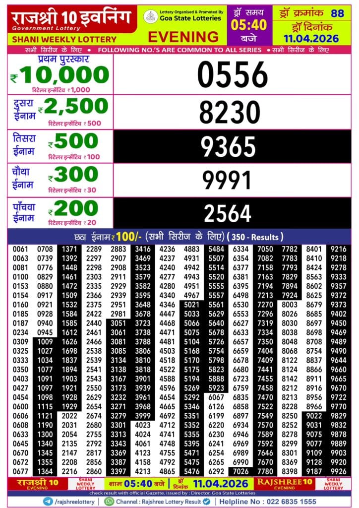 Rajshree 10 Evening Shani Weekly Lottery 11.04.2026 Result 5.40 PM 0 Likes 5 Views Related Articles 0 93Maharashtra Gajlaxmi Budh Weekly Draw 18.03.2026 Result 4.45 PM 0 58Maharashtra Mohini Weekly Draw 22.02.2026 Result 4.30 PM 0 101Maharashtra Ganeshlaxmi Vaibhav Weekly Draw 15.02.2026 Result 5 PM 0 59Punjab State Dear 50 Jackal Saturday Weekly Lottery 07.03.2026 Result 5 PM
