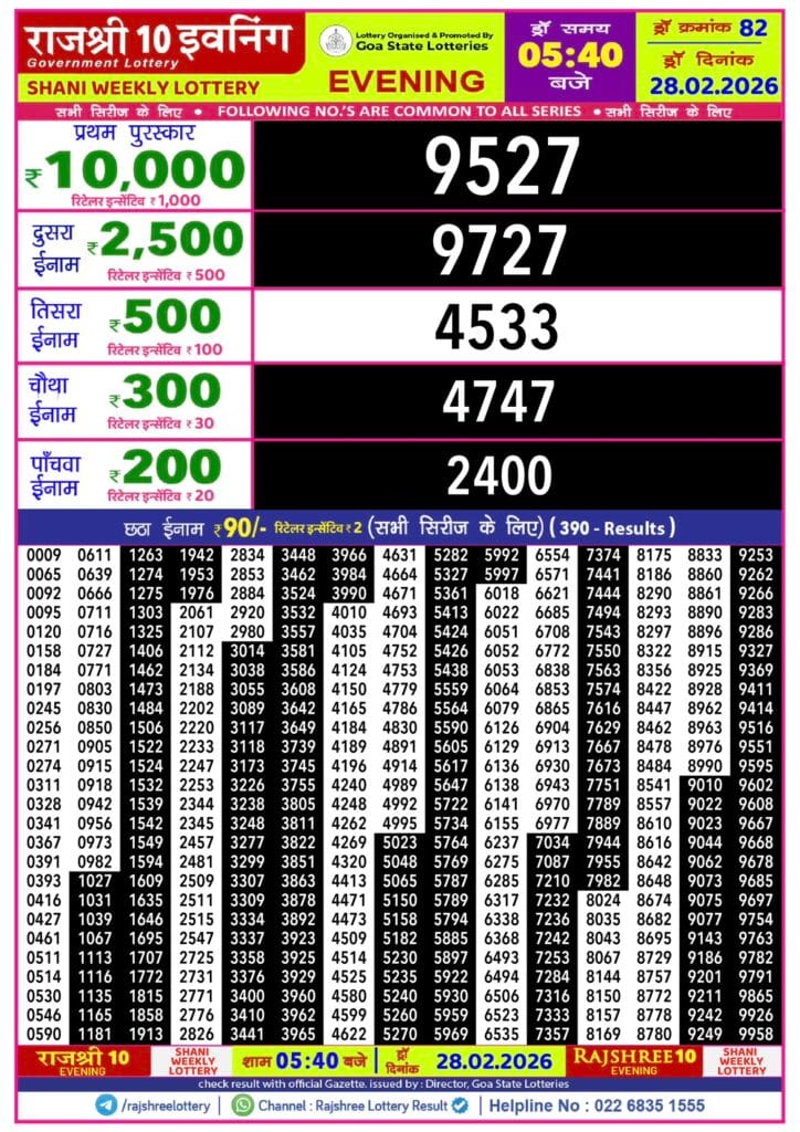 Rajshree 10 Evening Shani Weekly Lottery 28.2.2026 Result 5.40 PM 0 Likes 43 Views Related Articles 0 136Maharashtra Gajlaxmi Shani Weekly Draw 25.10.2025 Result 4.45pm 0 79Rajshree Friday Weekly Lottery 27.2.2026 Result 8 PM 0 55Maharashtra Ganeshlaxmi Dhan Weekly Draw 20.02.2026 Result 5 PM 0 24Rajshree Budh Weekly Lottery 08.04.2026 Result 2.25 PM