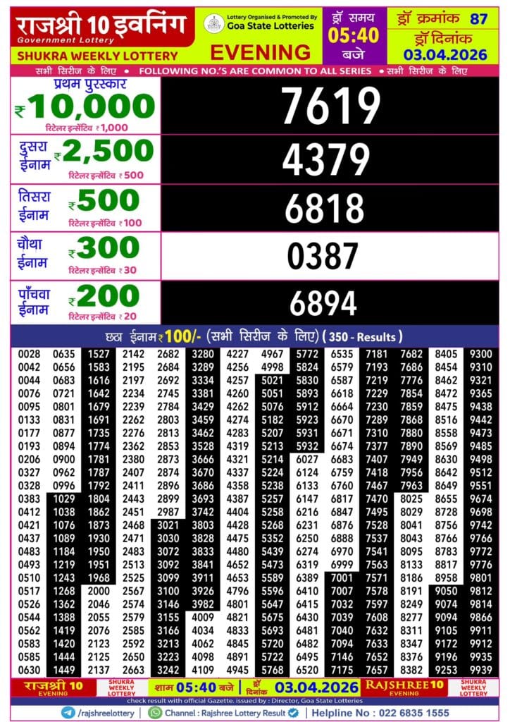 Rajshree 10 Evening Shukra Weekly Lottery 03.04.2026 Result 5.40 PM 0 Likes 22 Views Related Articles 0 55Golden Star Guru Weekly Lottery 05.03.2026 Result 7 PM 0 16Maharashtra Gajlaxmi Som Weekly Draw 06.04.2026 Result 4.45 PM 0 192Maharashtra Laxmi Weekly Draw Result 24.01.2026 0 96Maharashtra Gajlaxmi Budh Weekly Draw 21.01.2026 Result 4.45pm