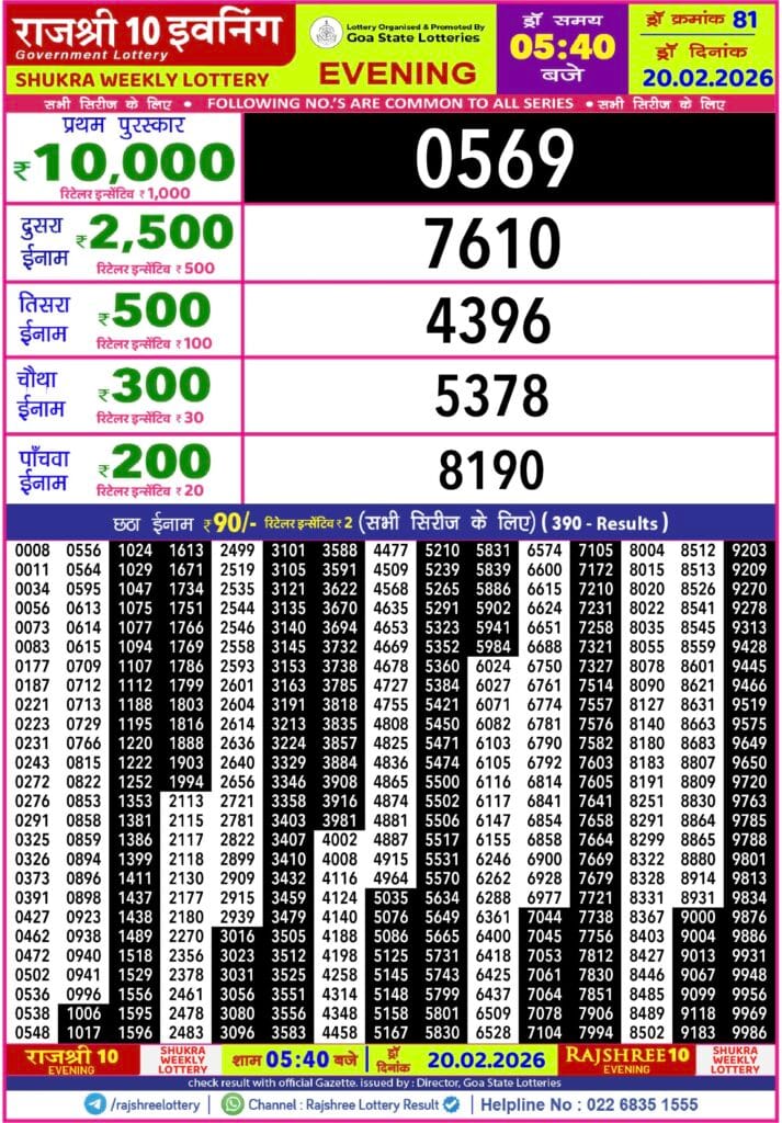 Rajshree 10 Evening Shukra Weekly Lottery 20.2.2026 Result 5.40 PM 0 Likes 21 Views Related Articles 0 105Maharashtra Ganeshlaxmi Gaurav Weekly Draw 13.11.2025 Result 5pm 0 77Punjab State Dear 50 Beast Monday Weekly Lottery 24.11.2025 At 6 PM 0 74Maharashtra Akarshak Pushkaraj Weekly Draw Result 5.2.2026 0 118Sikkim state dear x-mas bumper lottery 27 december 2025 at 6pm