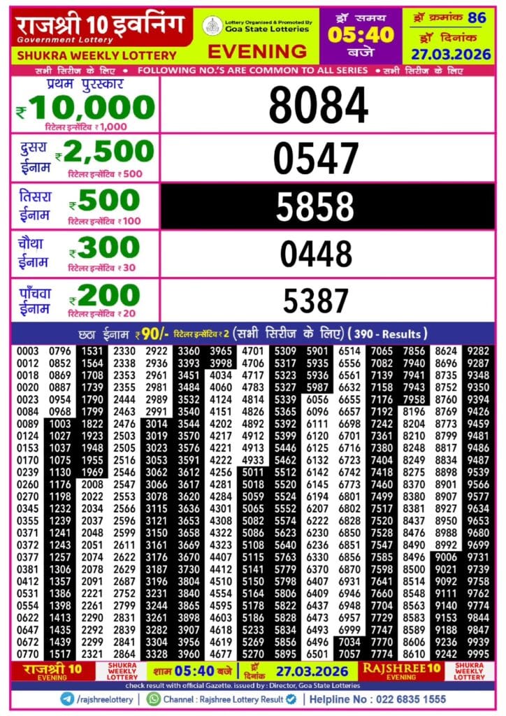 Rajshree 10 Evening Shukra Weekly Lottery 27.03.2026 Result 5.40 PM