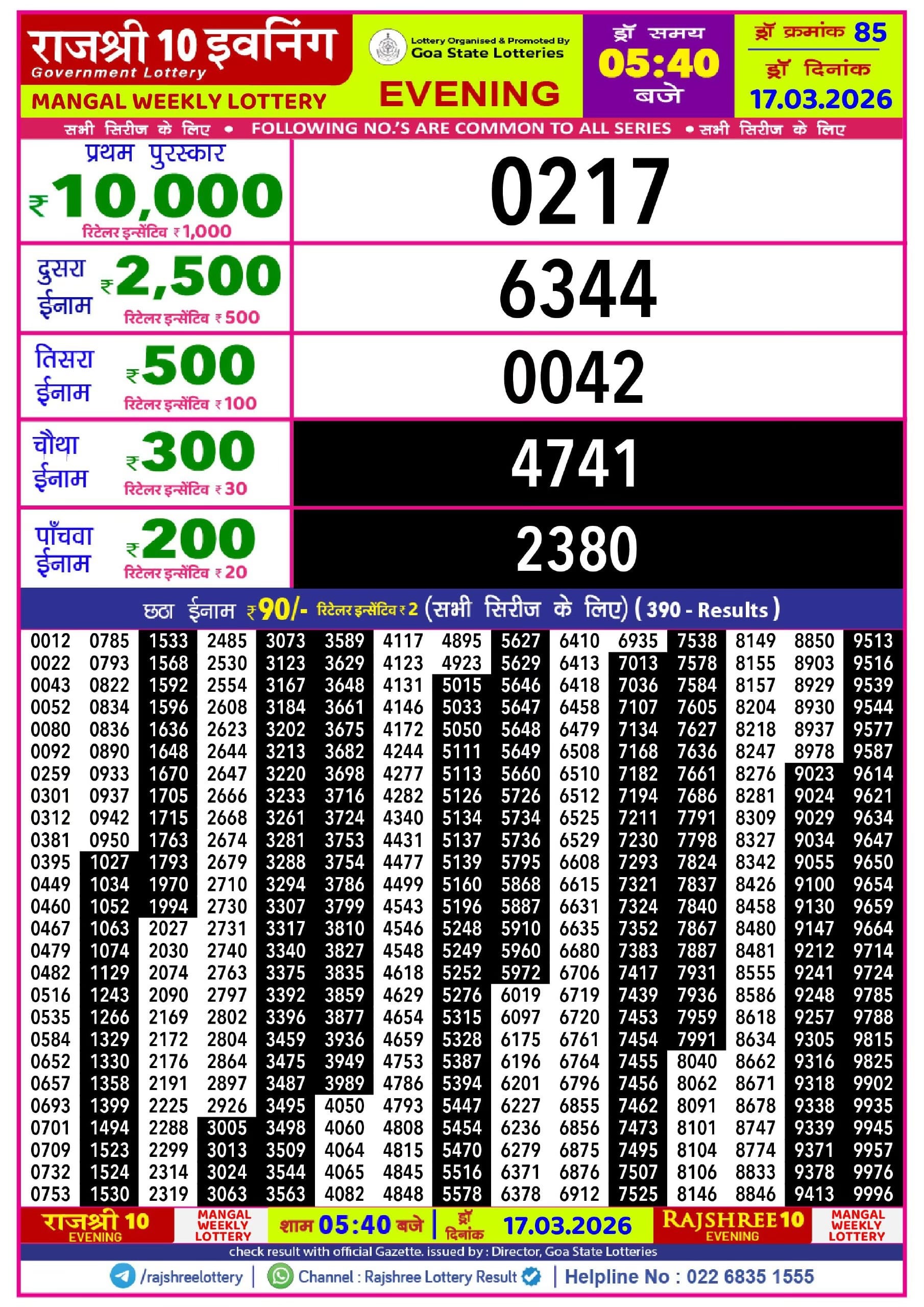 Rajshree 10 Evening Som Weekly Lottery 30.03.2026 Result 5.40 PM 0 Likes 26 Views Related Articles 0 46Rajshree Sunflower Sunday Weekly Lottery 15.02.2026 Result 4 PM 5 291Rajhsree 200 Monthly Lottery 19.3.2026 Result 6.30 PM Onwards (Gudipadwa Special) 0 51Rajshree Wednesday Weekly Lottery 01.04.2026 Result 8 PM 0 66Punjab State Dear 50 Bronco Tuesday 6pm Lottery Result 04.11.2025