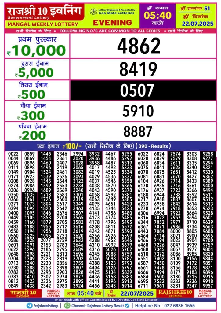 Rajshree 10 evening tuesday 5:40pm result 22.07.2025 0 Likes 59 Views Related Articles 0 83Mizoram State Golden 1000 Dhamaka Lottery 29.10.2025 At 6.15 PM 0 53Maharashtra Sahyadri Dhanlaxmi Weekly Draw 01.12.2025 Result 4.30pm 0 64Maharashtra Gajlaxmi Shani Weekly Draw 22.11.2025 Result 4.45pm 0 59Punjab State Dear 50 Buster Wednesday 6pm Lottery Result 26.11.2025