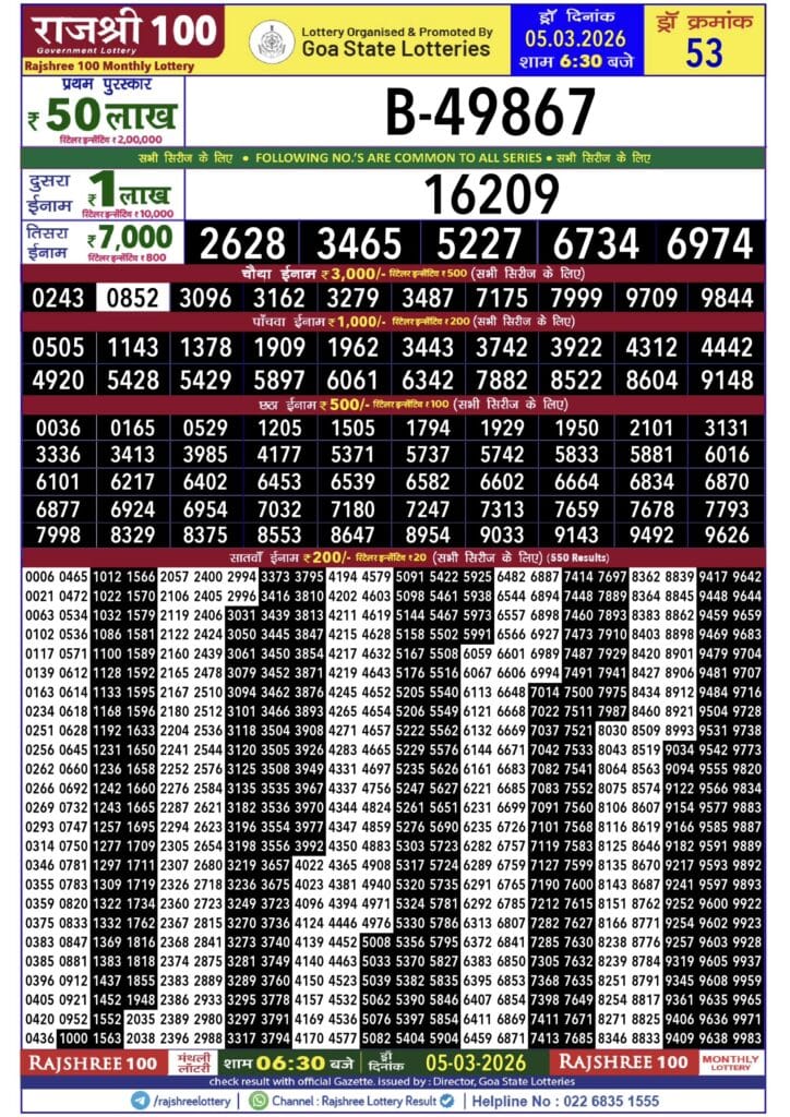 Rajshree 100 Monthly Lottery 05.03.2026 Result 6.30 PM (Holi Special)