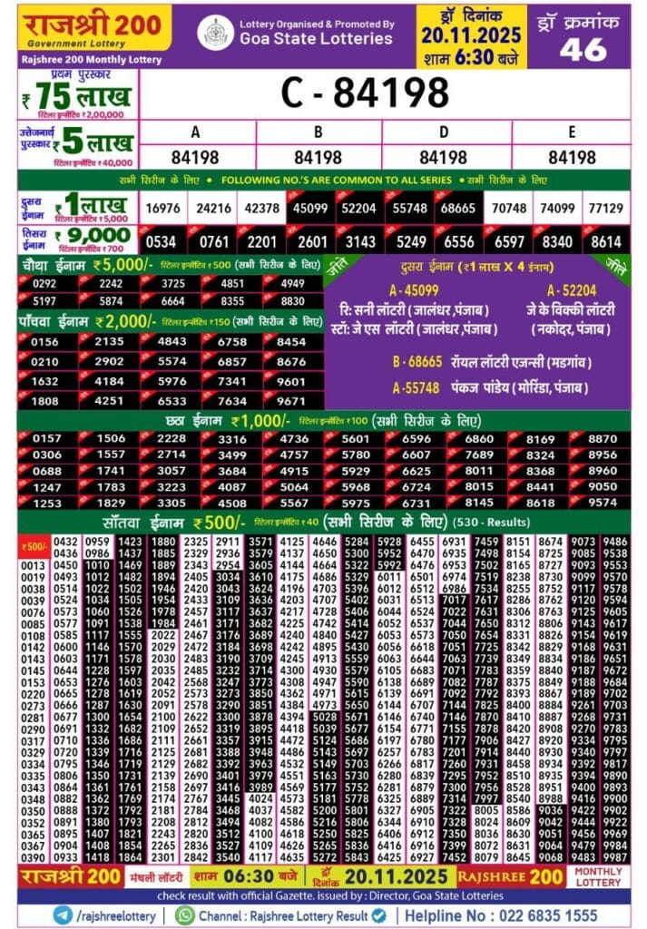 Rajshree 200 Monthly Lottery Result 20.11.2025 At 6.30 PM 0 Likes 99 Views Related Articles 0 80Maharashtra Mohini Weekly Draw 26.10.2025 Result 4.30pm 1 84Maharashtra Gajlaxmi Guru Weekly Draw 25.12.2025 Result 4.45pm 0 63Maharashtra Mohini Weekly Draw 14.12.2025 Result 4.30pm 0 64Maharashtra Ganeshlaxmi Shubh Weekly 30.12.2025 Result 5pm