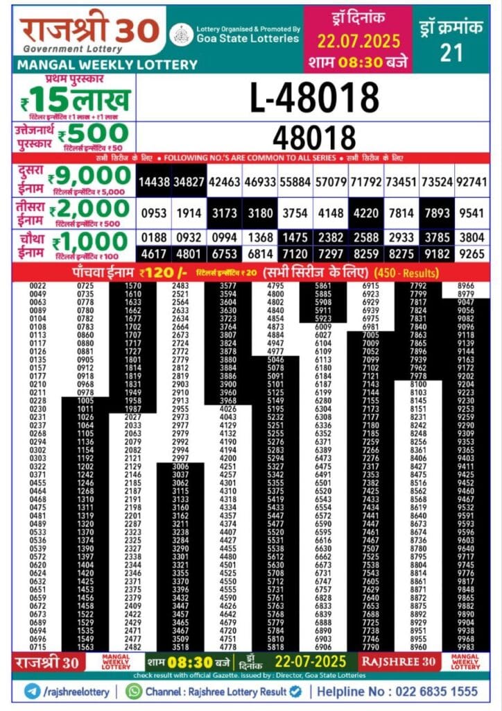 Rajshree 30 Lottery 8:30PM Daily Result 22 July 2025 0 Likes 62 Views Related Articles 0 59Punjab state dear 20 monthly lottery 22 July 2025 At 6 PM 0 60Maharashtra Sahyadri Dhanlaxmi Weekly Draw 27.10.2025 Result 4.30pm 0 51Punjab State Dear 50 Chief Thursday 6pm Lottery Result 27.11.2025 0 51Rajshree Budh Weekly Lottery 1PM Result 23.07.2025