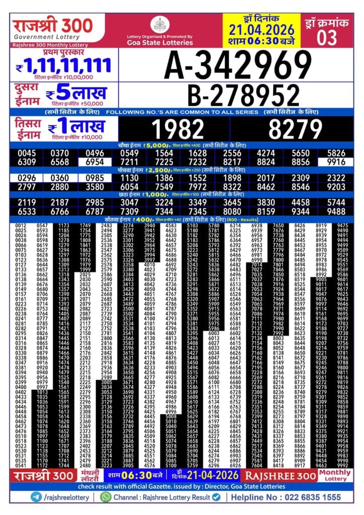 Rajshree 300 Monthly Lottery 21.04.2026 Result 6.30 PM 0 Likes 6 Views Related Articles 0 137Goa State Rajshree Diwali Special Lottery 30 October 2025 Result 6.30 PM 0 126Dear 10 Pine Tuesday 7 pm daily result 22 July 2025 0 106Punjab State Dear 50 Bronco Tuesday 6pm Lottery Result 11.11.2025 0 44Rajshree Som Weekly Lottery 06.04.2026 Result 2.25 PM