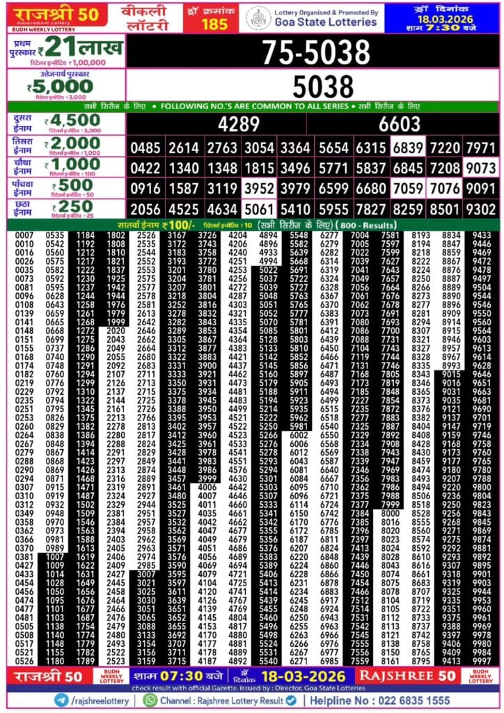 Rajshree 50 Budh Weekly Lottery 18.03.2026 Result 7.30 PM