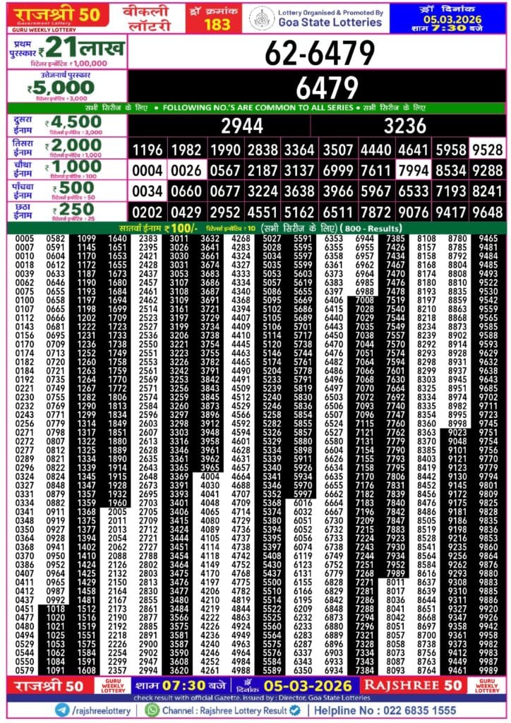 Rajshree 50 Guru Weekly Lottery 05.03.2026 Result 7.30 PM 0 Likes 57 Views Related Articles 0 74Rajshree 50 Shukra Weekly Lottery 20.03.2026 Result 7.30 PM 0 59Rajshree Budh Weekly Lottery 18.03.2026 Result 2.25 PM 0 52Sikkim State Labhlaxmi Charm Tuesday Weekly Lottery 24.2.2026 Result 4 PM 0 35Rajshree Mangal Weekly Lottery 24.03.2026 Result 2.25 PM