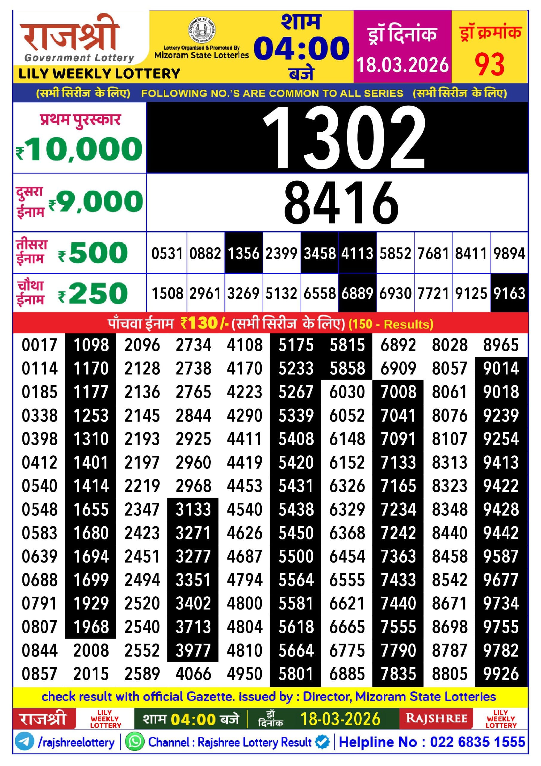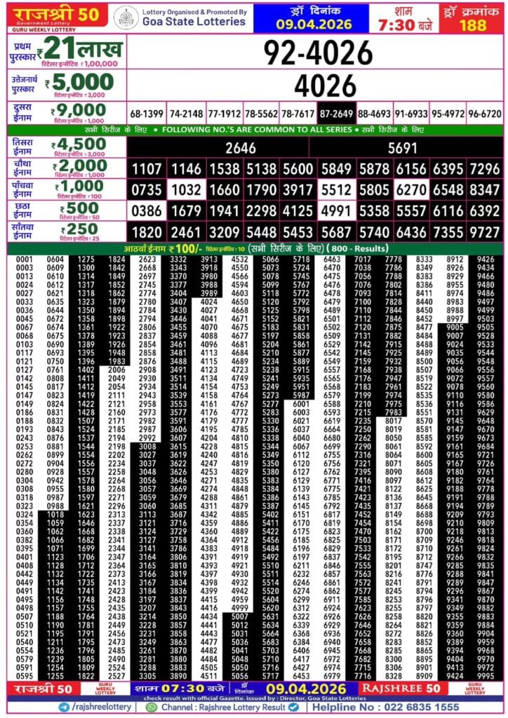 Rajshree 50 Guru Weekly Lottery 09.04.2026 Result 7.30 PM 0 Likes 11 Views Related Articles 0 83Maharashtra Gaurav Monthly Lottery 18.02.2026 Result 4 PM 0 52Rajshree Lily Weekly Lottery 18.03.2026 Result 4 PM 0 59Maharashtra Sahyadri Prabhalaxmi Weekly Draw 31.01.2026 Result 4.30pm 0 119Maharashtra Padmini Weekly Draw Result 22.07.2025