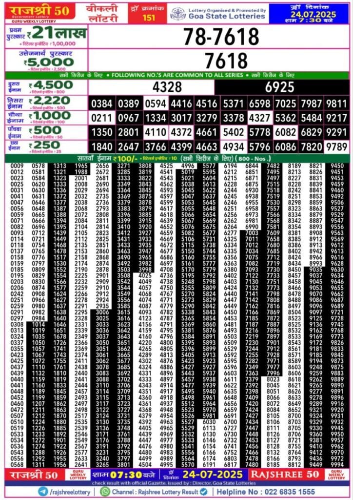 Rajshree 50 Guru Weekly Lottery Result 24.07.2025 0 Likes 77 Views Related Articles 0 44Maharashtra Ganeshlaxmi Samruddhi Weekly Draw 08.11.2025 Result 5pm 0 88Maharashtra Akshay Weekly Draw Result 03.12.2025 0 95Punjab state dear 100 monthly lottery 12.8.2025 At 6 PM 0 29Maharashtra Mohini Weekly Draw 14.12.2025 Result 4.30pm