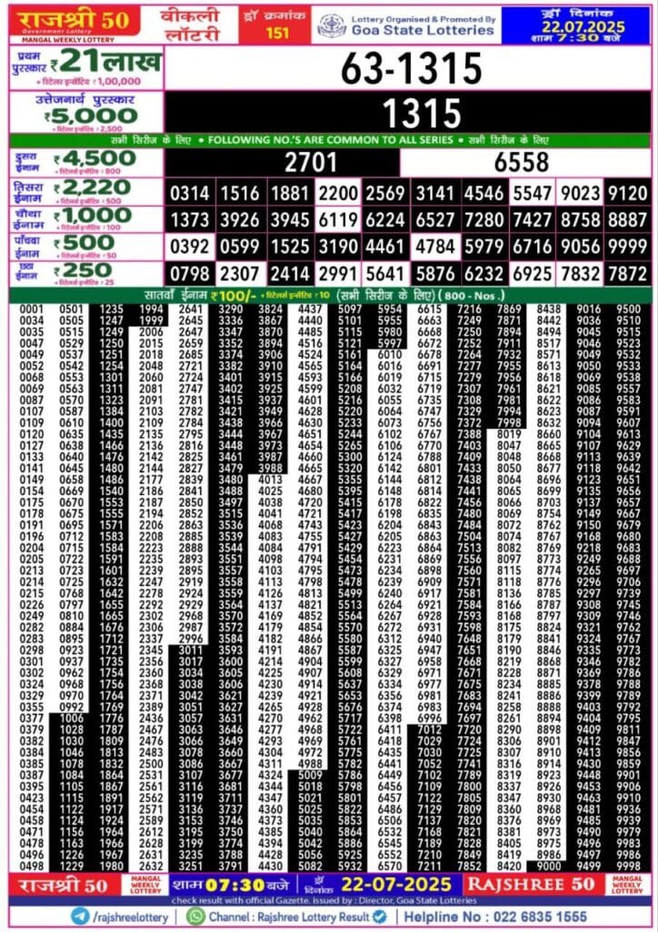 Rajshree 50 Lottery 7:30PM Daily Result 22 July 2025 0 Likes 58 Views Related Articles 0 61Dear dwarka monday Weekly 1pm result 21.07.2025 0 48Golden 100 Gold Monthly Lottery 03.12.2025 Result 6.30PM 0 55Punjab State Dear 50 Colt Friday 6pm Lottery Result 05.12.2025 0 26Maharashtra Ganeshlaxmi Bhagyashali Weekly Draw 22.12.2025 Result 5pm