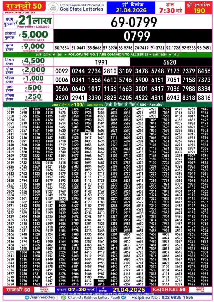 Rajshree 50 Mangal Weekly Lottery 21.04.2026 Result 7.30 PM 0 Likes 5 Views Related Articles 2 312Rajshree 100 Monthly Lottery 05.03.2026 Result 6.30 PM (Holi Special) 0 123Maharashtra Gajlaxmi Guru Weekly Draw 06.11.2025 Result 4.45pm 0 87Maharashtra Sahyadri Rajlaxmi Weekly Draw 20.03.2026 Result 4.30 PM 0 113Golden Star Mangal Weekly Lottery 27.01.2026 Result 9pm