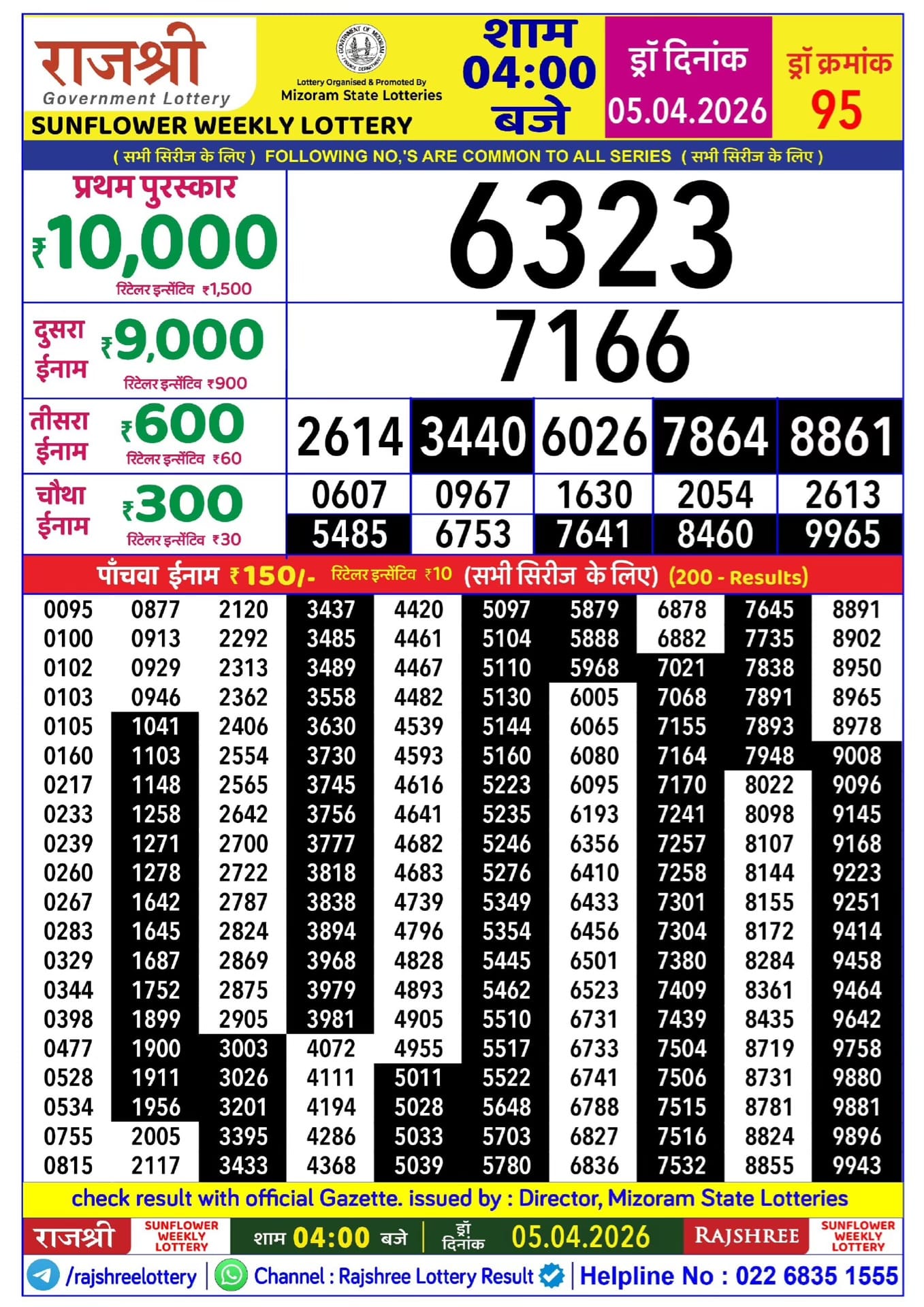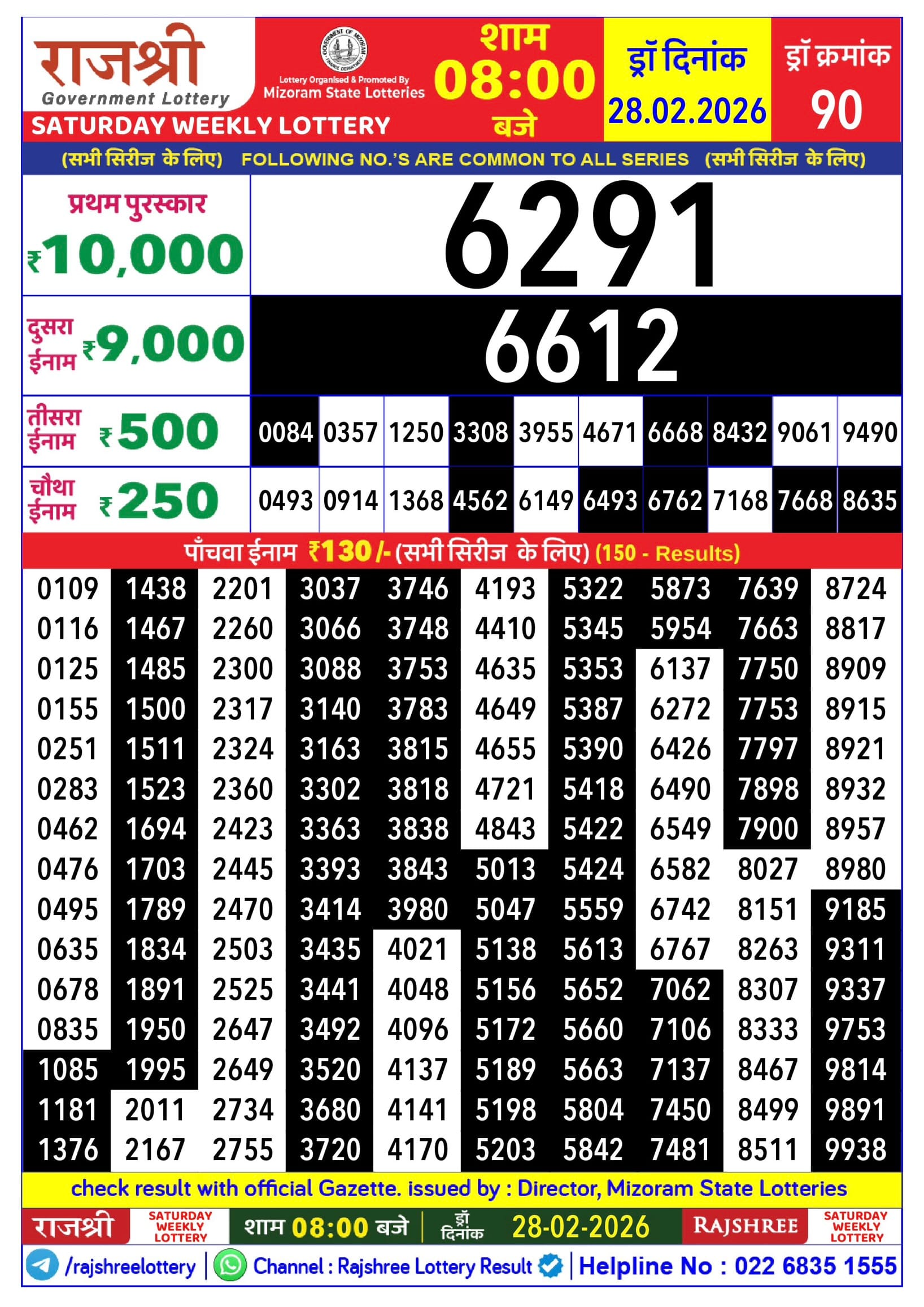 Rajshree 50 Shani Weekly Lottery 28.2.2026 Result 7.30 PM 0 Likes 43 Views Related Articles 0 221Mizoram state golden 100 gold monthly lottery 5.11.2025 At 6.30 PM 0 61Rajshree Saturday Weekly Lottery 28.2.2026 Result 8 PM 0 13Rajshree Sunflower Weekly Lottery 05.04.2026 Result 4 PM 0 42Rajshree Night Guru Weekly Lottery 19.2.2026 Result 9 PM