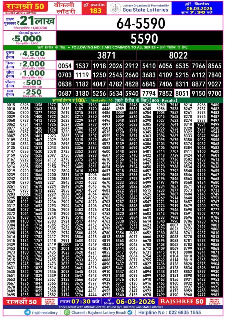 Rajshree 50 Shukra Weekly Lottery 06.03.2026 Result 7.30 PM 0 Likes 52 Views Related Articles 0 63Rajshree Shani Weekly Lottery 07.03.2026 Result 2.25 PM 0 124Punjab State Dear 50 Ranger Sunday 6pm Lottery Result 30.11.2025 0 83Maharashtra Ganeshlaxmi Dhan Weekly Draw 02.01.2025 Result 5 PM 1 212Maharashtra Akshay Weekly Draw Result 18.02.2026
