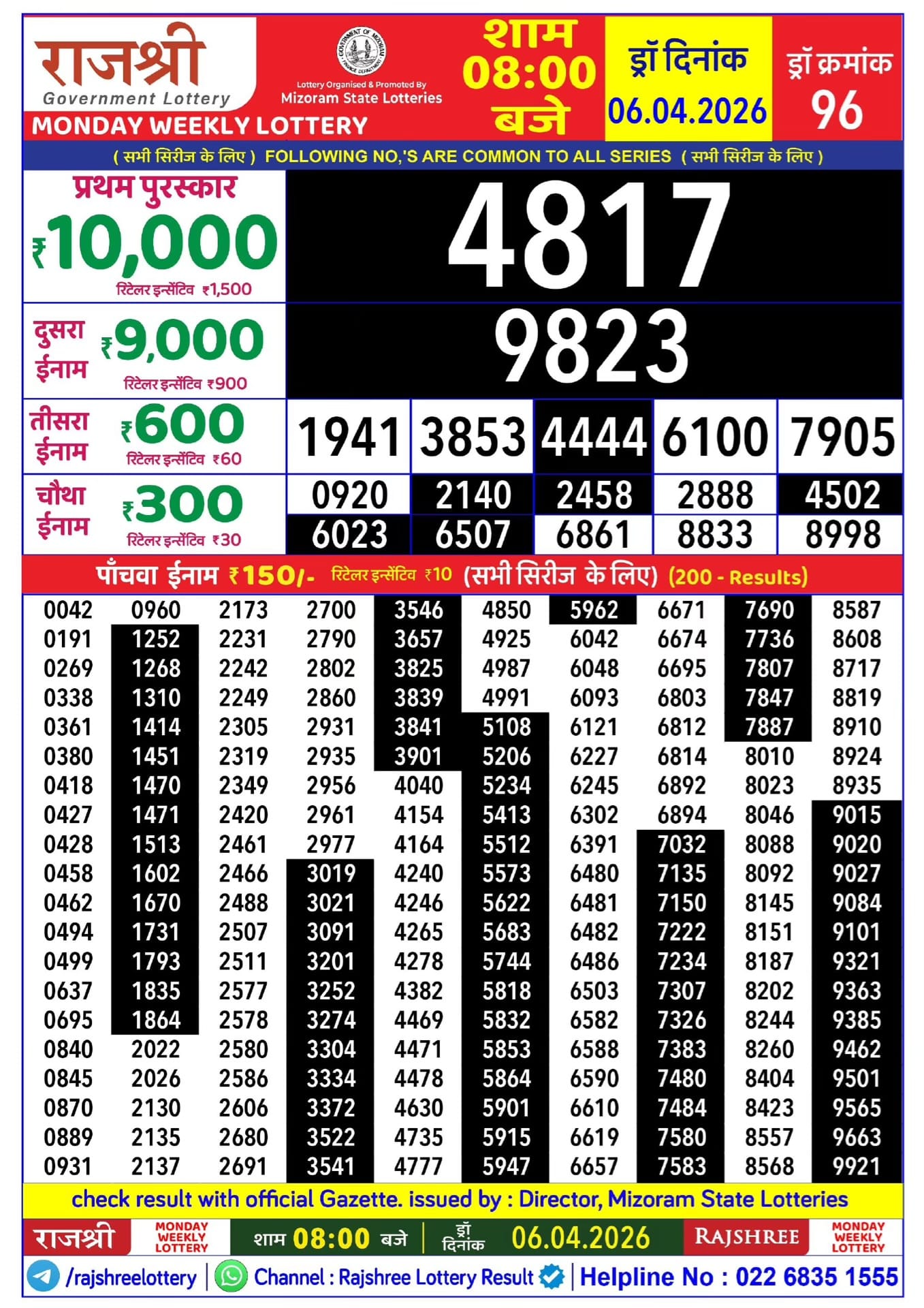 Rajshree 50 Som Weekly Lottery 02.03.2026 Result 7.30 PM 0 Likes 60 Views Related Articles 0 79Golden Star Ravi Weekly Lottery 25.01.2026 Result 9pm 0 38Maharashtra Sahyadri Rajlaxmi Weekly Draw 27.02.2026 Result 4.30 PM 0 41Rajshree Orchid Weekly Lottery 07.03.2026 Result 4 PM 0 54Maharashtra Mohini Weekly Draw 22.02.2026 Result 4.30 PM