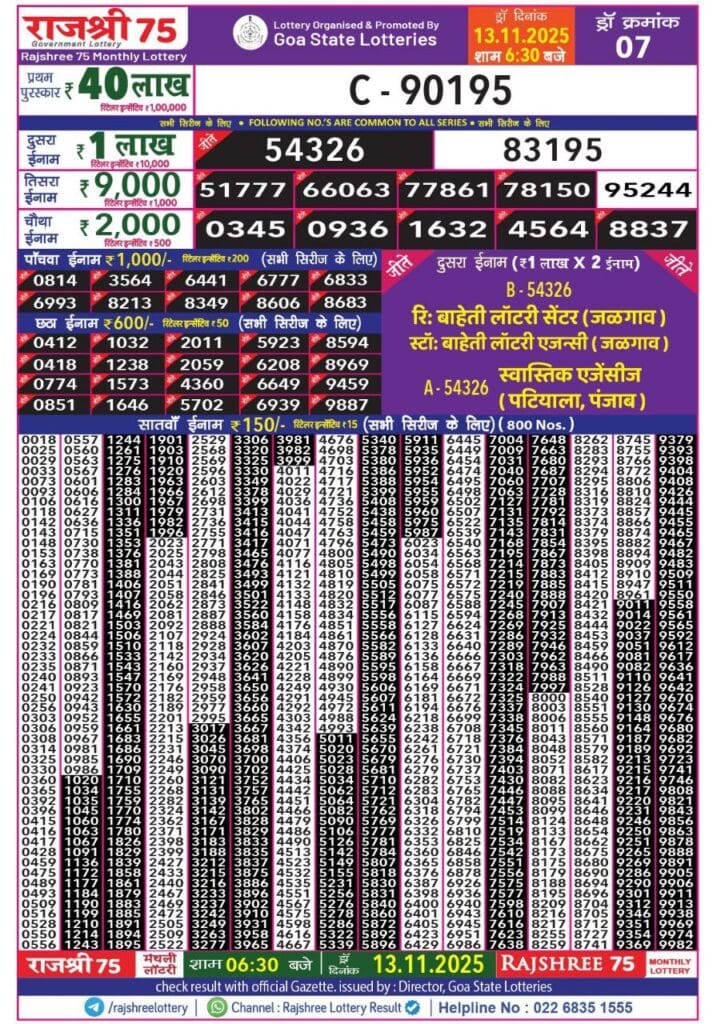 Rajshree 75 Monthly Lottery Result 13.11.2025 0 Likes 127 Views Related Articles 0 46Rajshree Lotus Weekly Lottery 19.2.2026 Result 4 PM 0 27Rajshree Sunday Weekly Lottery 05.04.2026 Result 8 PM 0 75Maharashtra Ganeshlaxmi Bhagyashali Weekly Draw 02.02.2026 Result 5pm 0 79Nagaland State Dear 2000 Monthly Lottery 8 November 2025 At 7 PM
