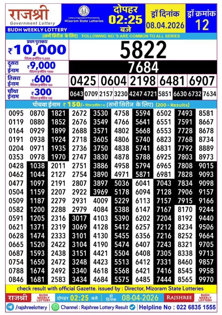 Rajshree Budh Weekly Lottery 08.04.2026 Result 2.25 PM 0 Likes 24 Views Related Articles 0 100Maharashtra Gajlaxmi Mangal Weekly Draw 10.02.2026 Result 4.45 PM 0 83Golden 250 Gold Monthly Lottery 25.02.2026 Result 6.30 PM 0 95Punjab State Dear 50 Beast Monday Weekly Lottery 24.11.2025 At 6 PM 0 71Punjab State Dear 50 Bronco Tuesday 6pm Lottery Result 04.11.2025