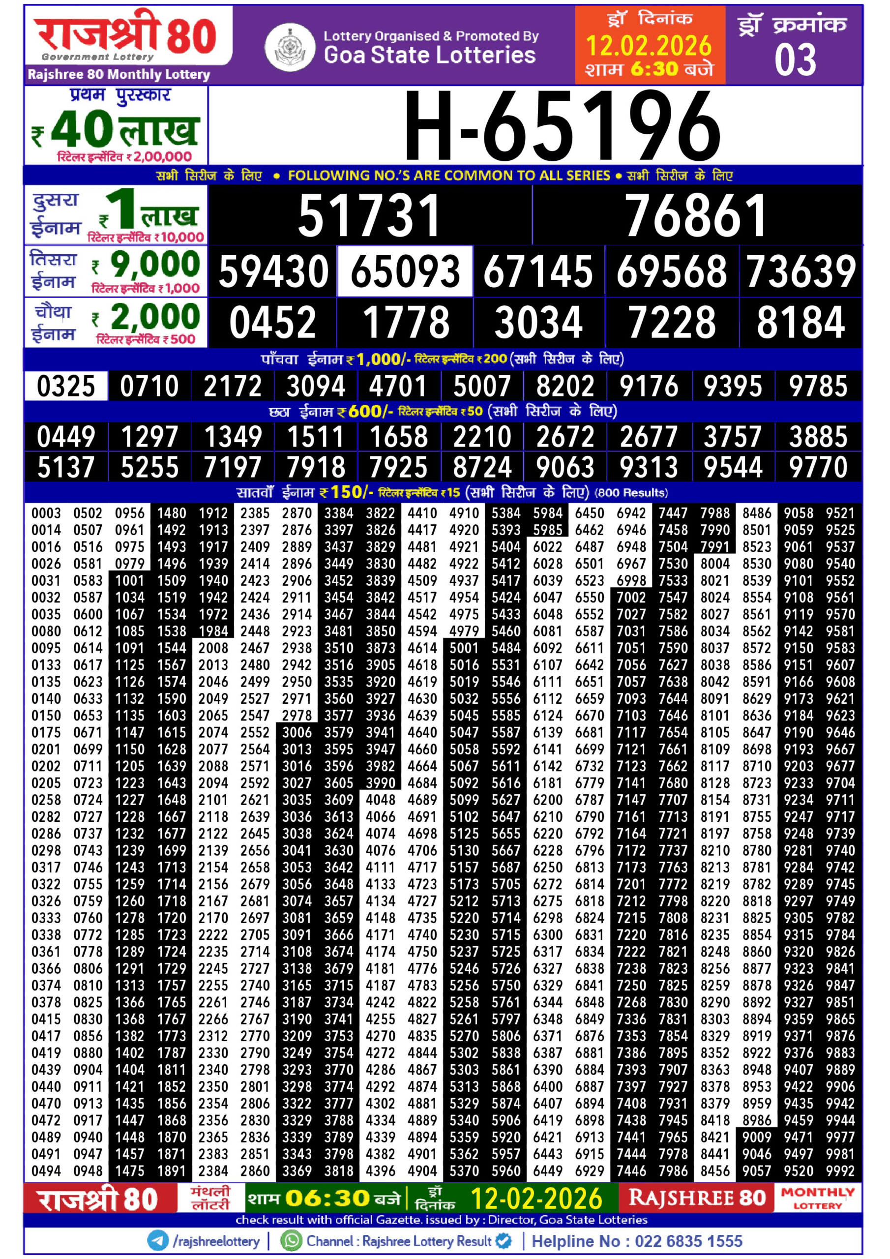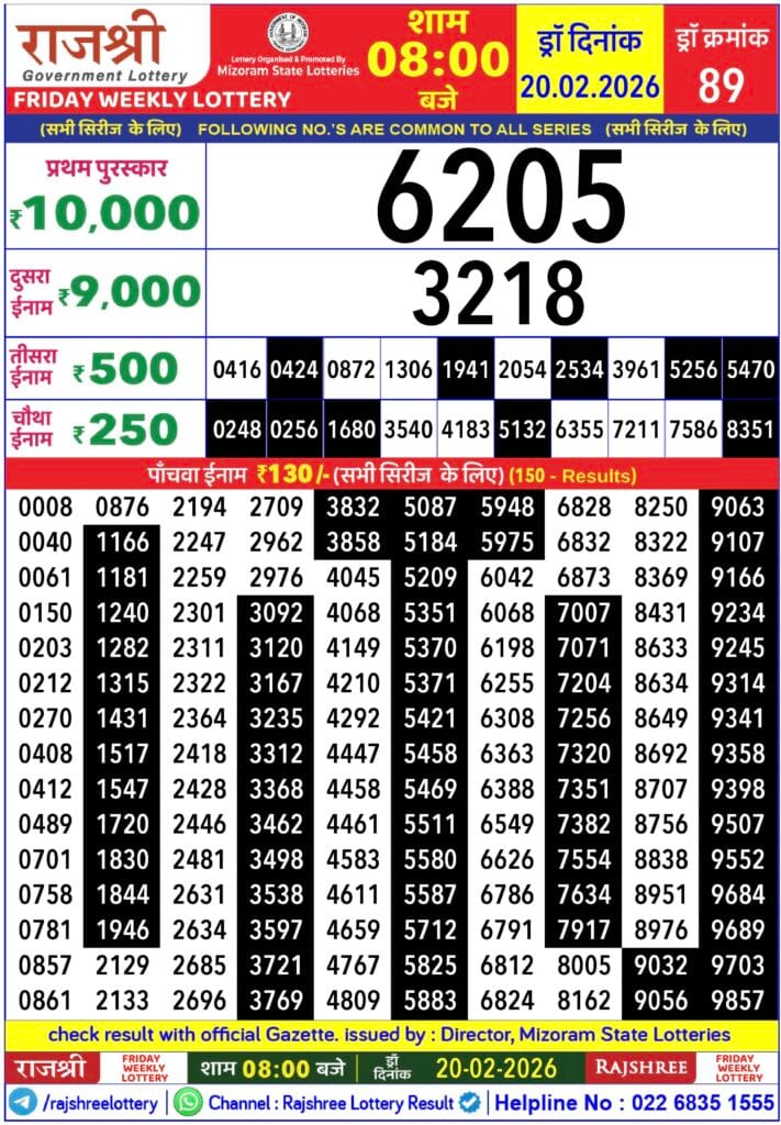 Rajshree Friday Weekly Lottery 20.2.2026 Result 8 PM 0 Likes 17 Views Related Articles 1 260Punjab State Dear Diwali Bumper 2025 New Scheme 0 14Maharashtralaxmi Weekly Draw Result 21.02.2026 1 56Rajshree 80 Monthly Lottery 12.2.2026 Result 6.30 PM 0 66Maharashtra Ganeshlaxmi Samruddhi Weekly Draw 10.01.2026 Result 5pm