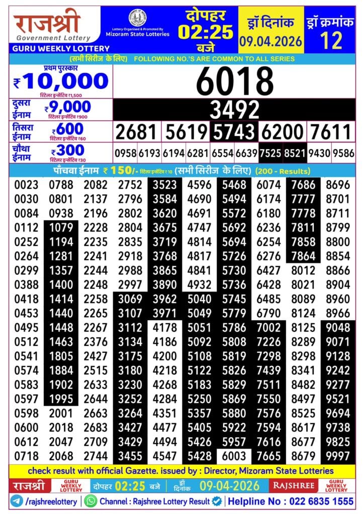 Rajshree Guru Weekly Lottery 09.04.2026 Result 2.25 PM 0 Likes 12 Views Related Articles 0 73Rajshree 50 Ravi Weekly Lottery 15.03.2026 Result 7.30 PM 0 35Rajshree Budh Weekly Lottery 01.04.2026 Result 2.25 PM 0 108Rajshree 50 Lottery 7:30PM Daily Result 22 July 2025 0 42Goa State Rajshree 50 Monthly Lottery 26.03.2026 At 6.30 PM