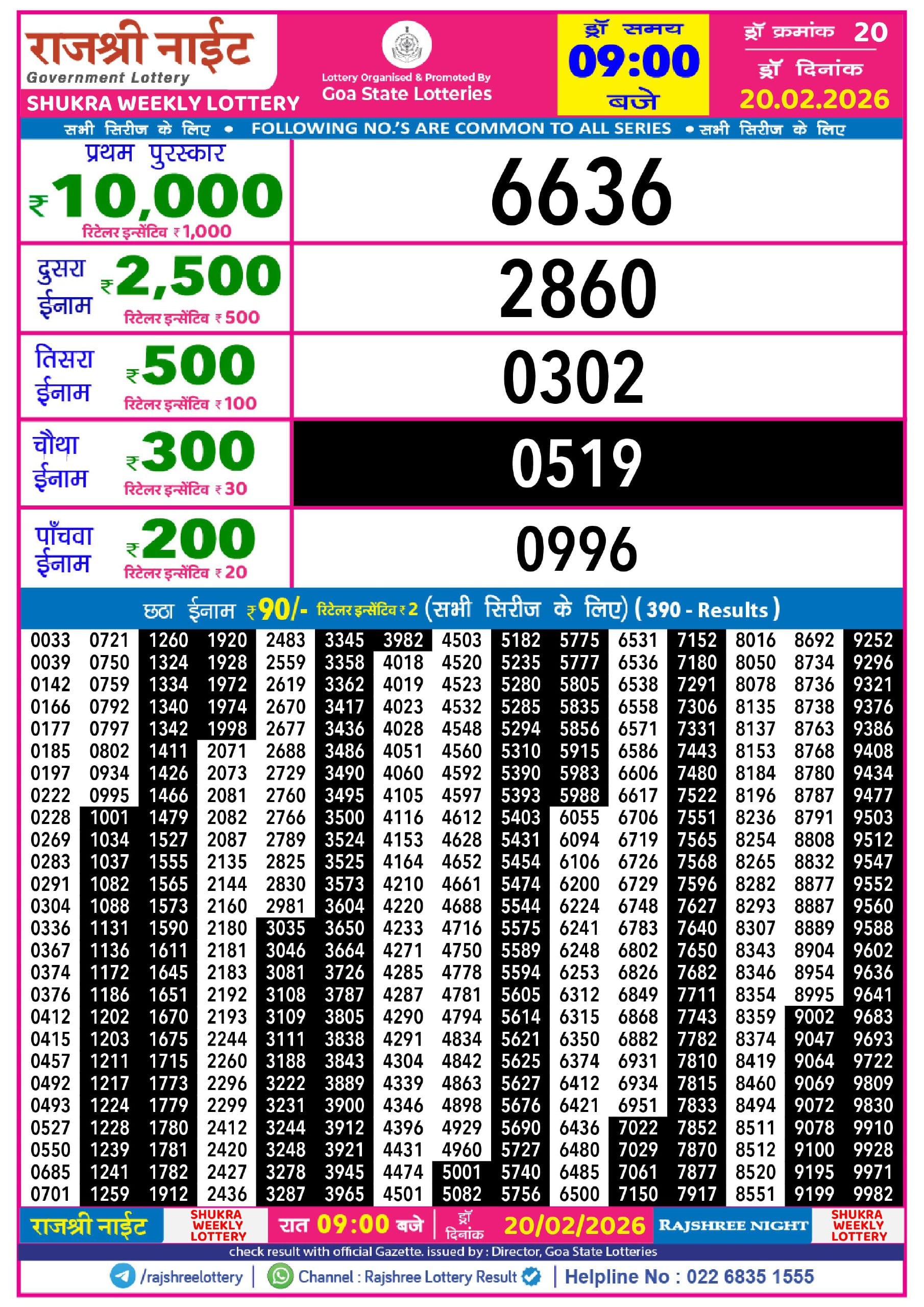 Rajshree Guru Weekly Lottery 19.2.2026 Result 2.25 PM 0 Likes 23 Views Related Articles 0 68Mh. Gajlaxmi Guru Weekly Draw 22.01.2026 Result 4.45pm 0 111Maharashtra Ganeshlaxmi Samruddhi Weekly Draw 01.11.2025 Result 5pm 0 92Punjab State Dear 50 Buster Wednesday 6pm Lottery Result 03.12.2025 0 27Rajshree Night Shukra Weekly Lottery 20.2.2026 Result 9 PM