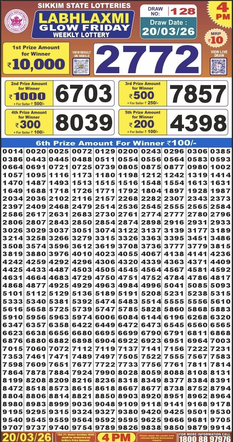 Rajshree Jasmine Weekly Lottery 27.2.2026 Result 4 PM 0 Likes 41 Views Related Articles 0 127Maharashtra Ganeshlaxmi Samruddhi Weekly Draw 07.02.2026 Result 5 PM 0 53Sikkim State Labhlaxmi Glow Friday Weekly Lottery 20.03.2026 Result 4 PM 0 122Punjab State Dear 50 Bronco Tuesday 6PM Result 18.11.2025 0 59Maharashtra Vaibhavlaxmi Weekly Draw Result 27.03.2026