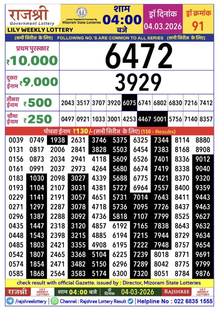 Rajshree Lily Weekly Lottery 04.03.2026 Result 4 PM 0 Likes 55 Views Related Articles 0 53Sikkim State Labhlaxmi Power Sunday Weekly Lottery 15.03.2026 Result 4 PM 0 81Sikkim State Labhlaxmi Glad Weekly Lottery 29.1.2026 Result 4 PM 0 75Maharashtra Tejaswini Monthly Draw Result 20.02.2026 0 134Rajshree 08.00 PM Weekly Lottery Result 24.07.2025