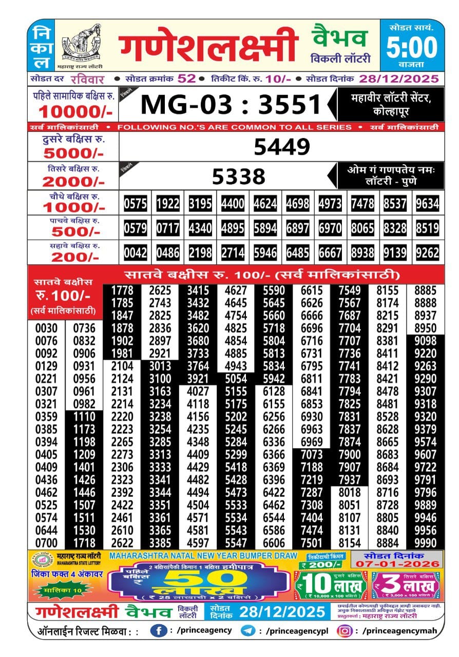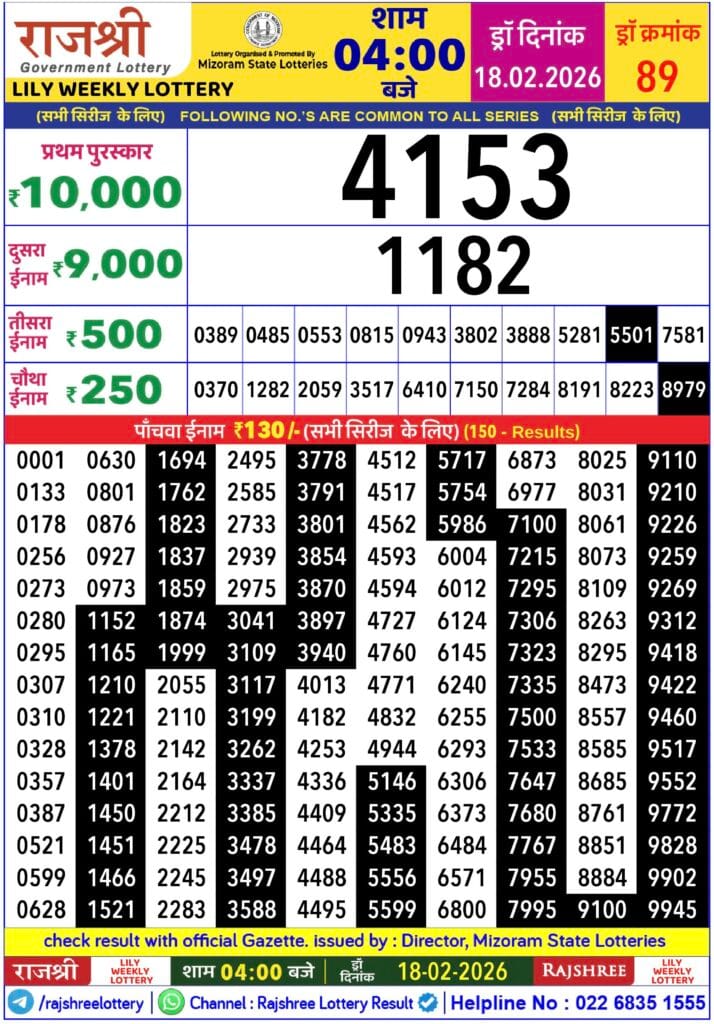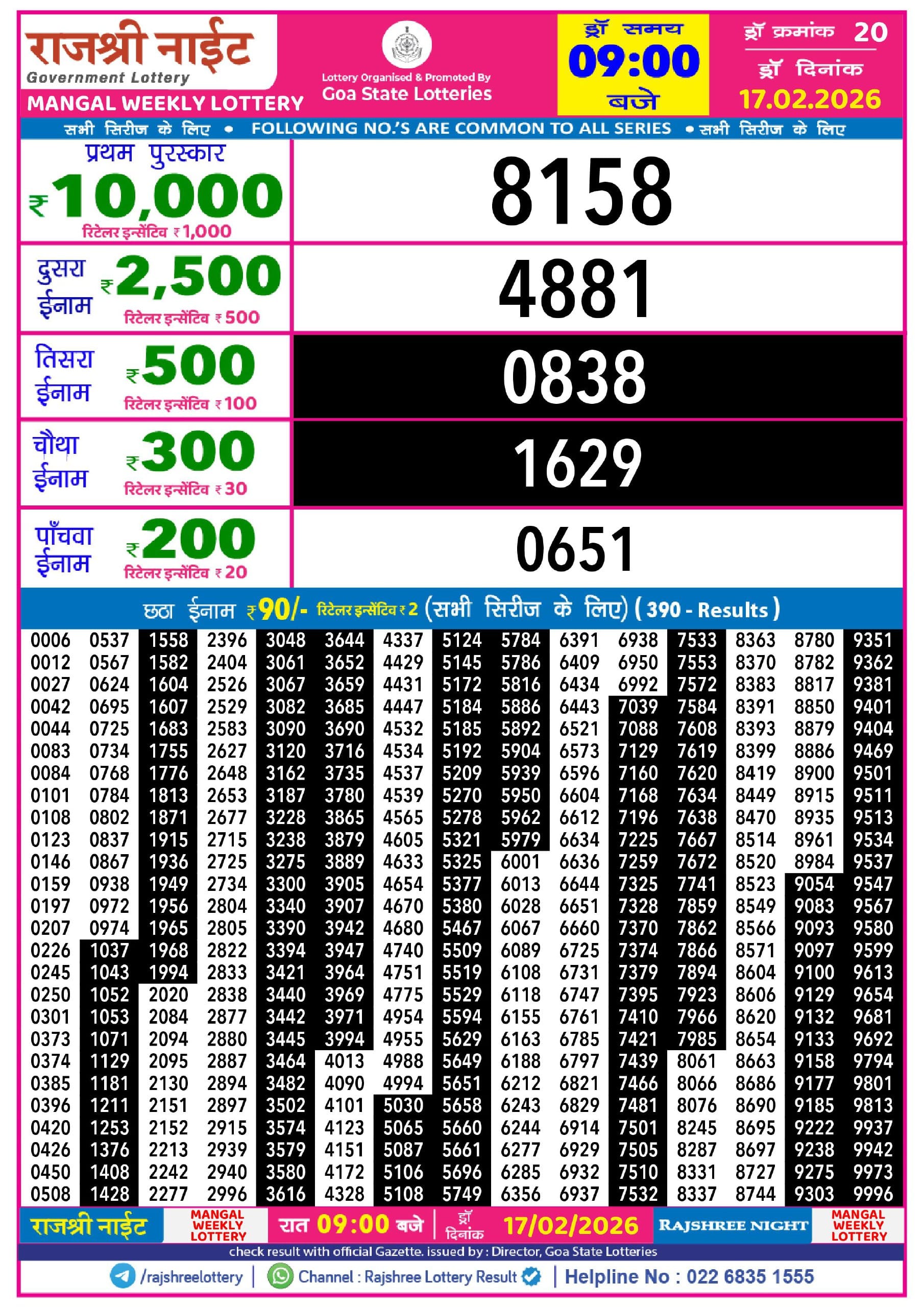 Rajshree Lily Weekly Lottery 18.2.2026 Result 4 PM 0 Likes 24 Views Related Articles 0 79Maharashtra Ganeshlaxmi Vaibhav Weekly Draw 28.12.2025 Result 5pm 0 31Rajshree Night Mangal Weekly Lottery 17.2.2026 Result 9 PM 1 133Maharashtra Sahyadri Rajlaxmi Weekly Draw 31.10.2025 Result 4.30pm 0 108Punjab state dear 20 monthly lottery 26.8.2025 result 6pm