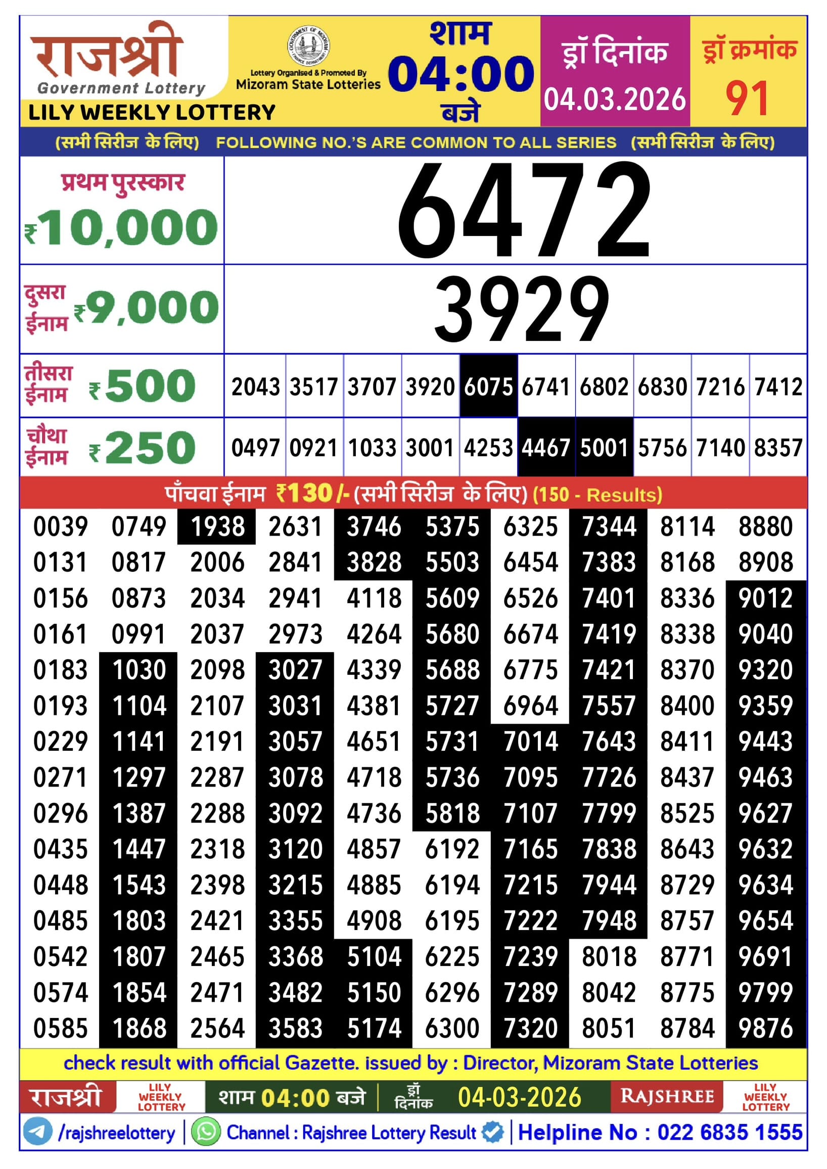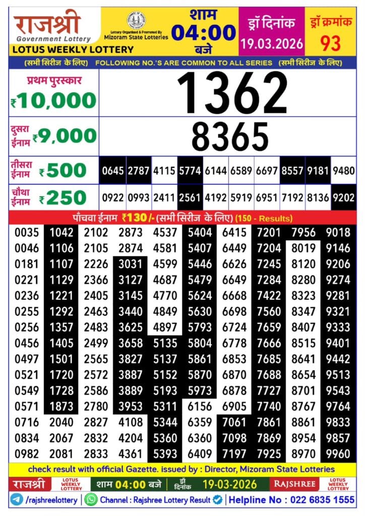 Rajshree Lotus Weekly Lottery 19.03.2026 Result 4 PM 0 Likes 52 Views Related Articles 0 50Rajshree 50 Guru Weekly Lottery 26.2.2026 Result 7.30 PM 0 168Maharashtra Sahyadri Vijayalaxmi Weekly Draw 28.01.2026 Result 4.30pm 1 117Dear comet tuesday weekly 6PM Result 22.07.2025 0 135Golden Star Guru Weekly Lottery 01.01.2026 Result 9 PM