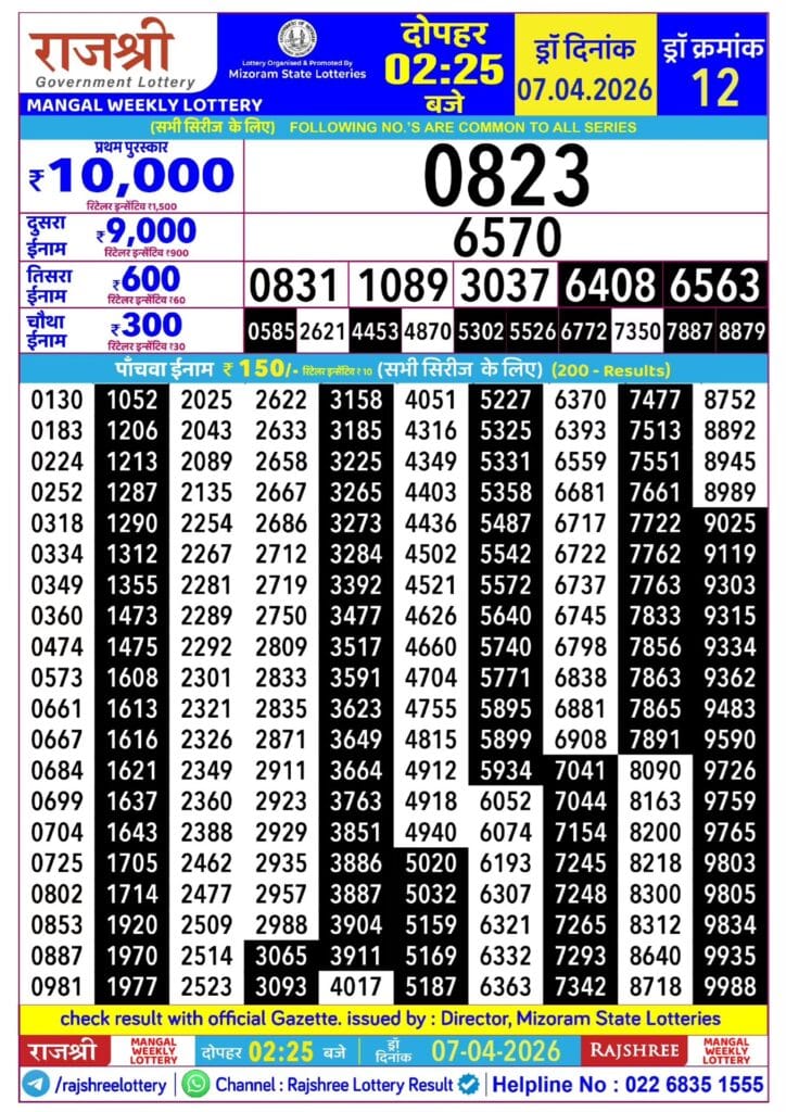 Rajshree Mangal Weekly Lottery 07.04.2026 Result 2.25 PM 0 Likes 6 Views Related Articles 0 80Maharashtra Ganeshlaxmi Gaurav Weekly Draw 08.01.2026 Result 5 PM 0 87Maharashtra Padmini Weekly Draw Result 17.03.2026 0 33Rajshree Tuesday Weekly Lottery 31.03.2026 Result 8 PM 0 142Maharashtra Sahyadri Rajlaxmi Weekly Draw 02.01.2026 Result 4.30 PM
