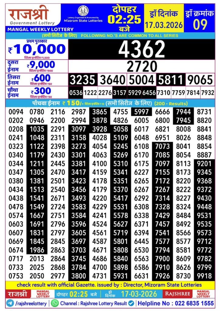 Rajshree Mangal Weekly Lottery 17.03.2026 Result 2.25 PM 0 Likes 35 Views Related Articles 1 73Golden Star Mangal Weekly Lottery 03.03.2026 Result 7 PM 0 25Golden Star Som Weekly Lottery 30.03.2026 Result 8.30 PM 0 35Maharashtra Sahyadri Mahalaxmi Weekly Draw 24.03.2026 Result 4.30 PM 0 53Punjab State Dear 50 Buster Wednesday Weekly Lottery 18.2.2026 Result 5 PM