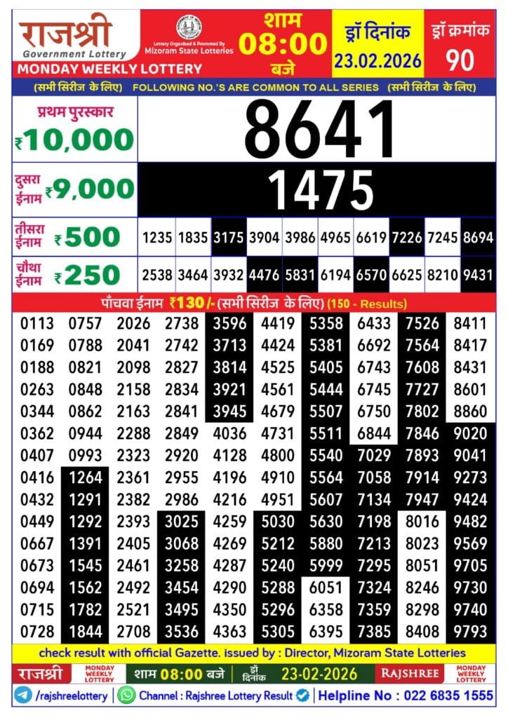 Rajshree Monday Weekly Lottery 23.2.2026 Result 8 PM 0 Likes 8 Views Related Articles 0 108Maharashtra Laxmi Weekly Draw Result 24.01.2026 0 23Rajshree 10 Evening Tuesday Weekly Lottery 17.02.2026 Result 5.40 PM 0 124Maharashtra Gajlaxmi Budh Weekly Draw Result 29.10.2025 0 32Golden Star Ravi Weekly Lottery 31.01.2026 Result 9pm