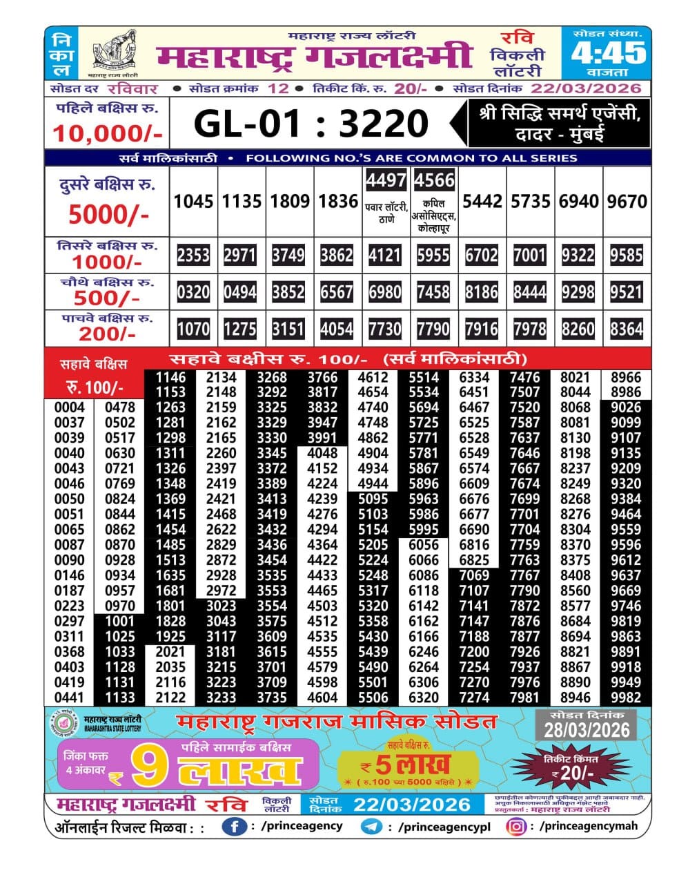Rajshree Night Guru Weekly Lottery 26.03.2026 Result 9 PM 0 Likes 60 Views Related Articles 0 138Golden 100 Gold Monthly Lottery 01.04.2026 At 6.30 PM (Gudipadwa Special) 0 79Maharashtra Ganeshlaxmi Gaurav Weekly Draw 08.01.2026 Result 5 PM 0 67Maharashtra Gajlaxmi Ravi Weekly Draw 22.03.2026 Result 4.45 PM 0 90Maharashtra Gajlaxmi Mangal Weekly Draw 13.01.2026 Result 4.45pm