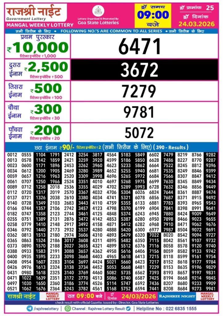 Rajshree Night Mangal Weekly Lottery 24.03.2026 Result 9 PM 0 Likes 41 Views Related Articles 0 121Maharashtra Ganeshlaxmi Dhan Weekly Draw 28.11.2025 Result 5pm 1 288Maharashtra Akarshak Pushkaraj Weekly Draw Result 30.10.2025 0 90Rajshree Weekly Lottery 8PM Result 21.07.2025 35 131Punjab State Dear 200 Monthly Lottery 3 January 2026 At 6 PM