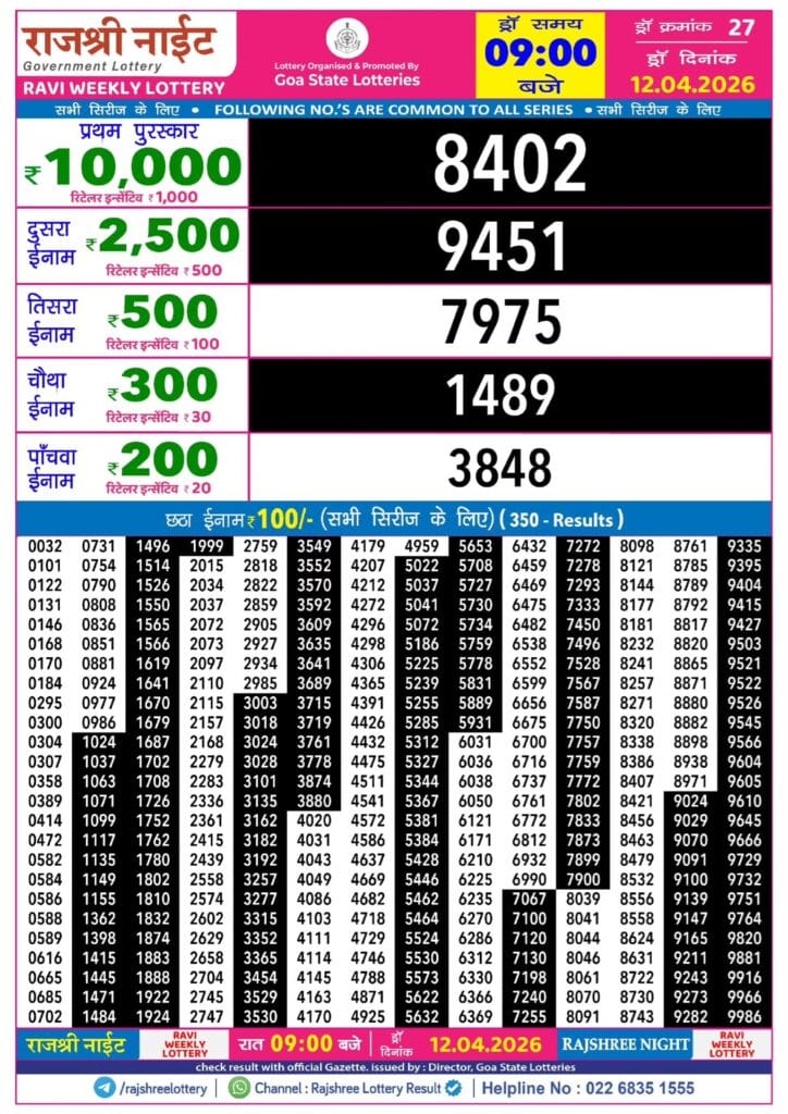Rajshree Night Ravi Weekly Lottery 12.04.2026 Result 9 PM 0 Likes 14 Views Related Articles 0 78Rajshree Night Shukra Weekly Lottery 20.2.2026 Result 9 PM 0 92Golden Star Shukra Weekly Lottery 13.02.2026 Result 7 PM 0 125Maharashtra Ganeshlaxmi Bhagyashali Weekly Draw 24.11.2025 Result 5pm 0 70Maharashtra Ganeshlaxmi Maghi Ganpati Monthly Draw 14.02.2026