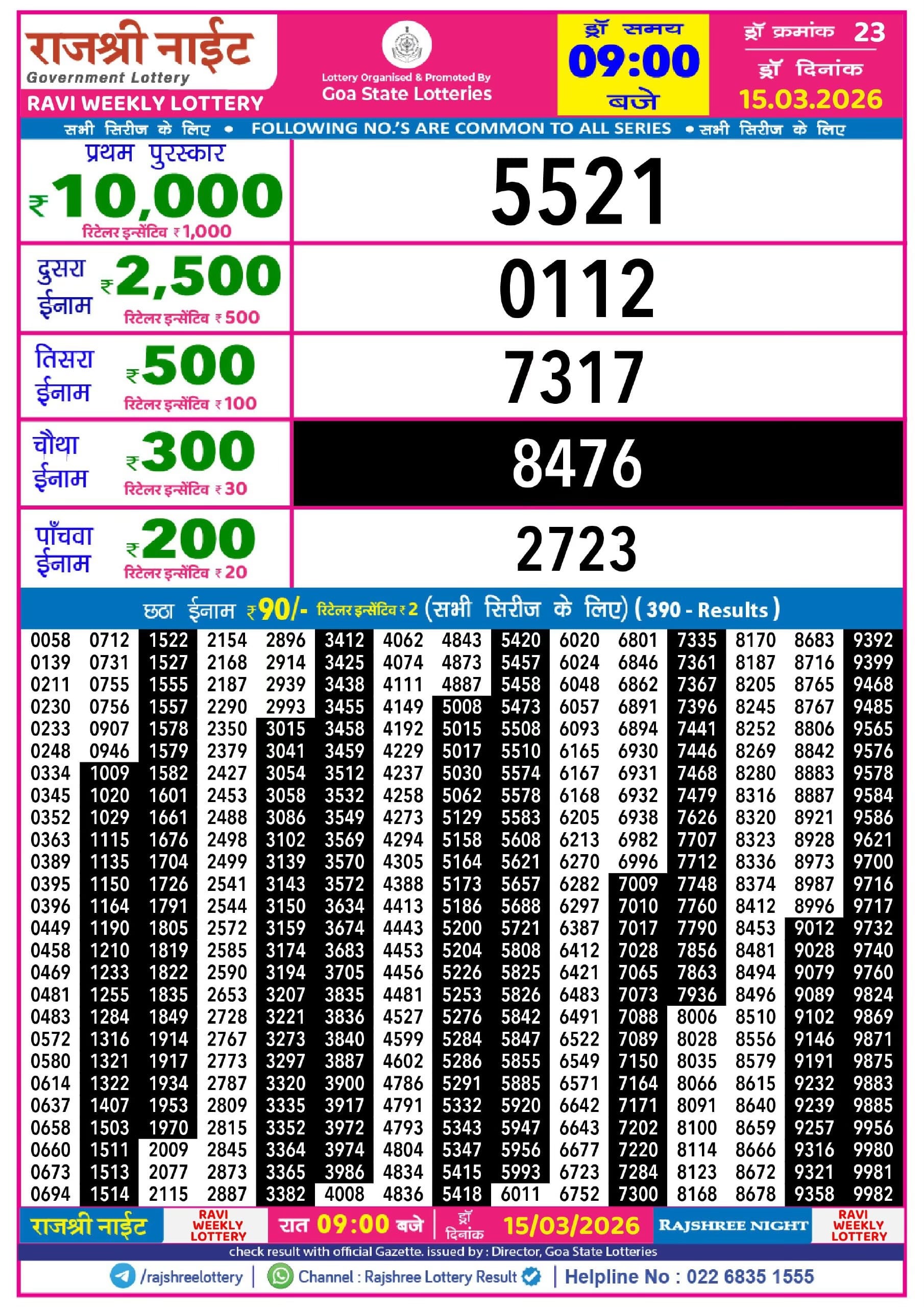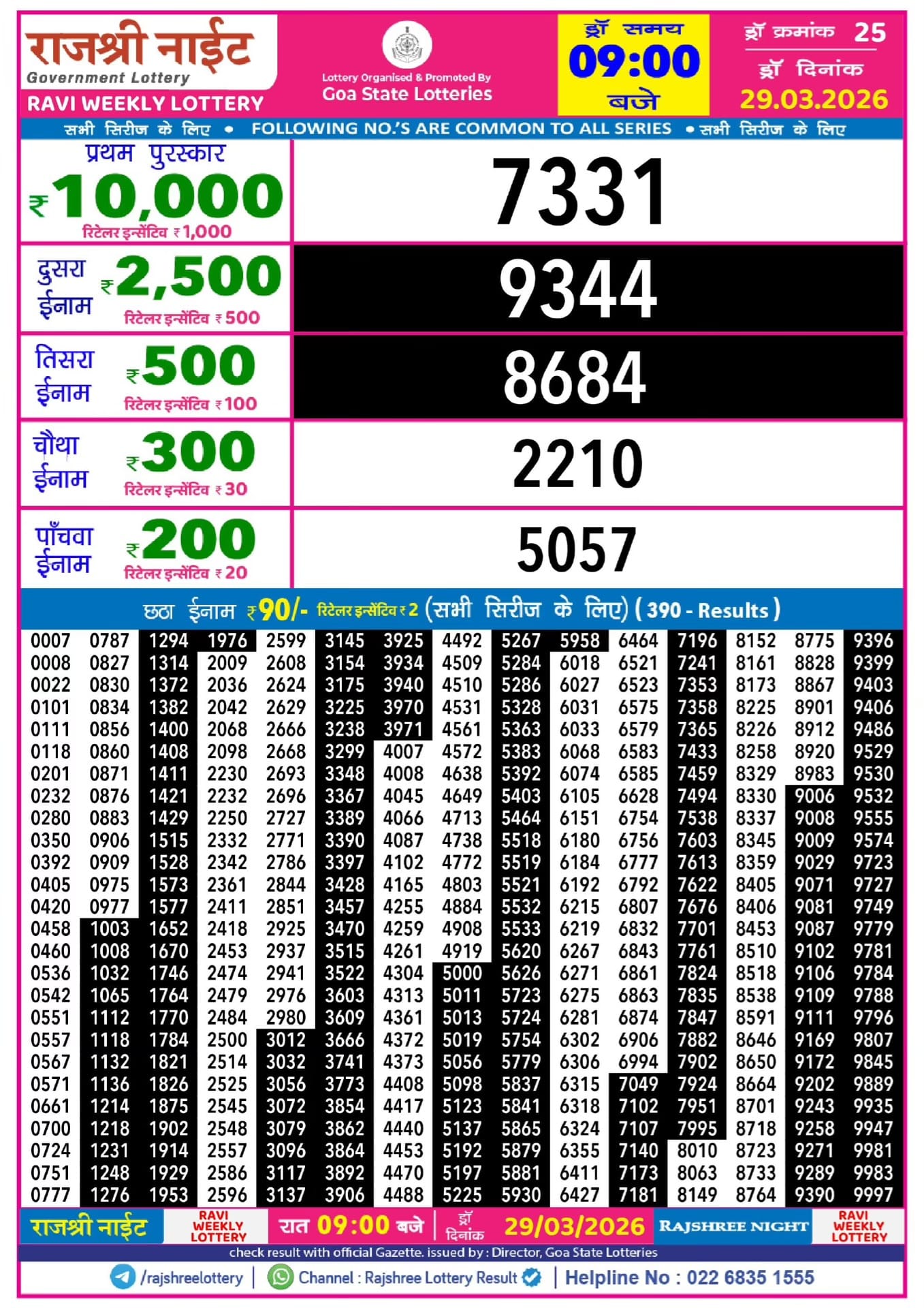 Rajshree Night Shukra Weekly Lottery 20.03.2026 Result 9 PM 0 Likes 61 Views Related Articles 1 124Golden 250 Gold Monthly Lottery 23.07.2025 Result 6.30pm 0 180Golden 100 Gold Monthly Lottery 5.11.2025 Result 6.30pm 0 19Rajshree Night Ravi Weekly Lottery 29.03.2026 Result 9 PM 0 75Punjab State Dear 50 Beast Monday 6pm Lottery Result 19.01.2026