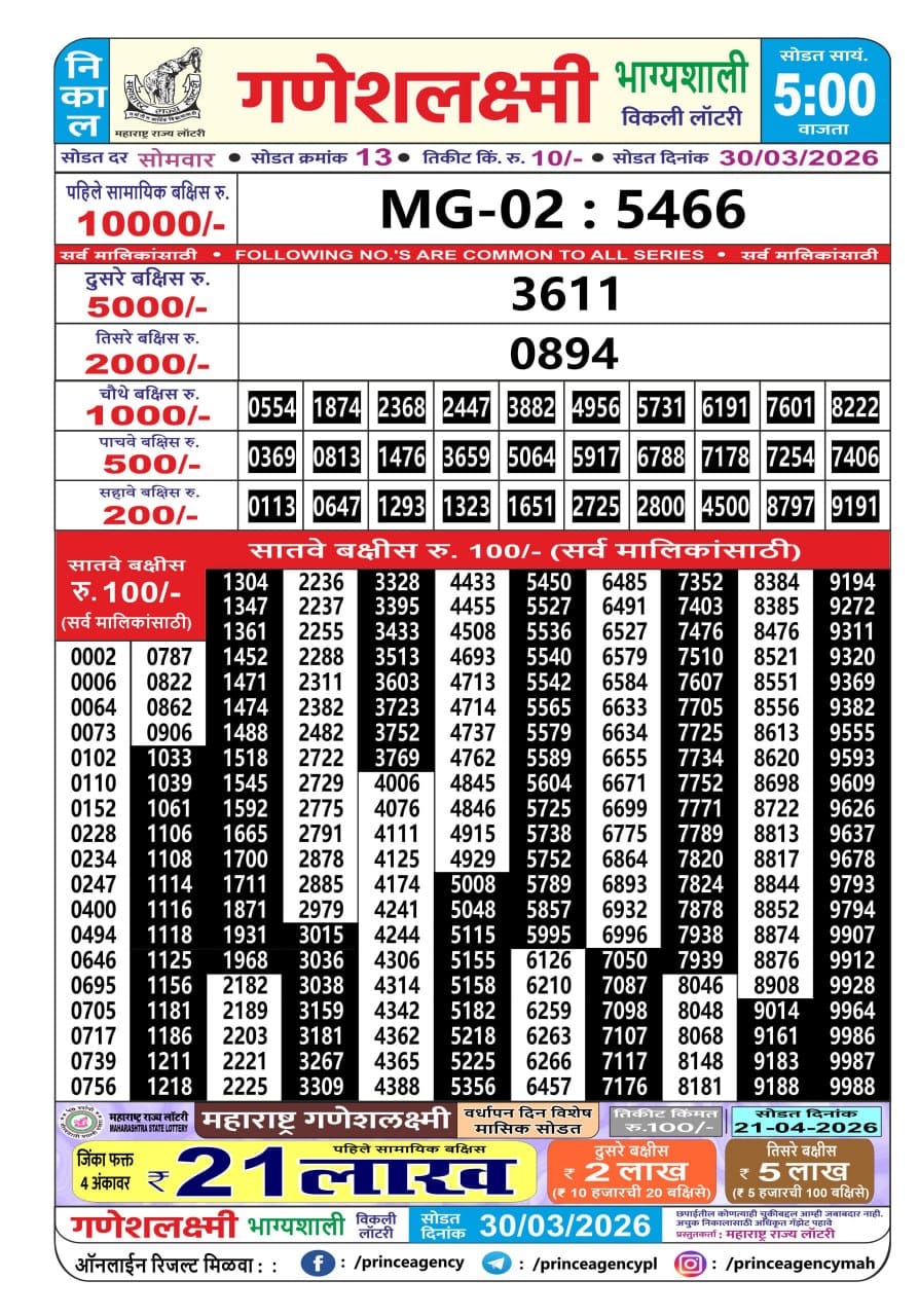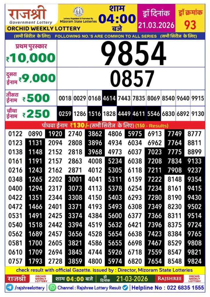 Rajshree Orchid Weekly Lottery 21.03.2026 Result 4 PM 0 Likes 36 Views Related Articles 0 131Maharashtra Gajlaxmi Budh Weekly Draw 05.11.2025 Result 4.45pm 0 98Maharashtra Tejawini Monthly Draw Result 20.11.2025 0 68Golden Star Guru Weekly Lottery 08.01.2026 Result 9 PM 0 79Maharashtra Gaurav Monthly Lottery 18.02.2026 Result 4 PM