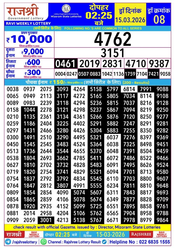 Rajshree Ravi Weekly Lottery 15.03.2026 Result 2.25 PM 0 Likes 44 Views Related Articles 0 85Punjab State Dear 50 Colt Friday Weekly Lottery 13.2.2026 Result 5 PM 0 37Rajshree Thursday Weekly Lottery 26.2.2026 Result 8 PM 0 79Golden Star Ravi Weekly Lottery 25.01.2026 Result 9pm 0 60Rajshree 10 Evening Budh Weekly Lottery 04.03.2026 Result 5.40 PM