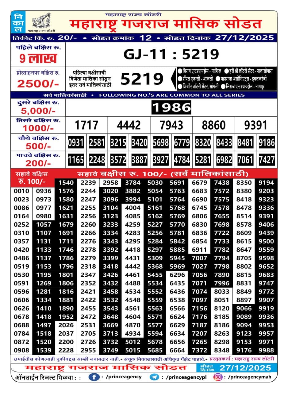 Rajshree Shani Weekly Lottery 21.2.2026 Result 2.25 PM 0 Likes 18 Views Related Articles 0 128Punjab state dear 200 monthly lottery 4-10-2025 at 8pm 1 157Punjab dear 100 monthly lottery 08.07.2025 result 6pm 0 116Maharashtra Ganeshlaxmi Vijayee Weekly Draw Result 29.10.2025 0 102Maharashtra Gajlaxmi Guru Weekly Draw 18.12.2025 Result 4.45pm