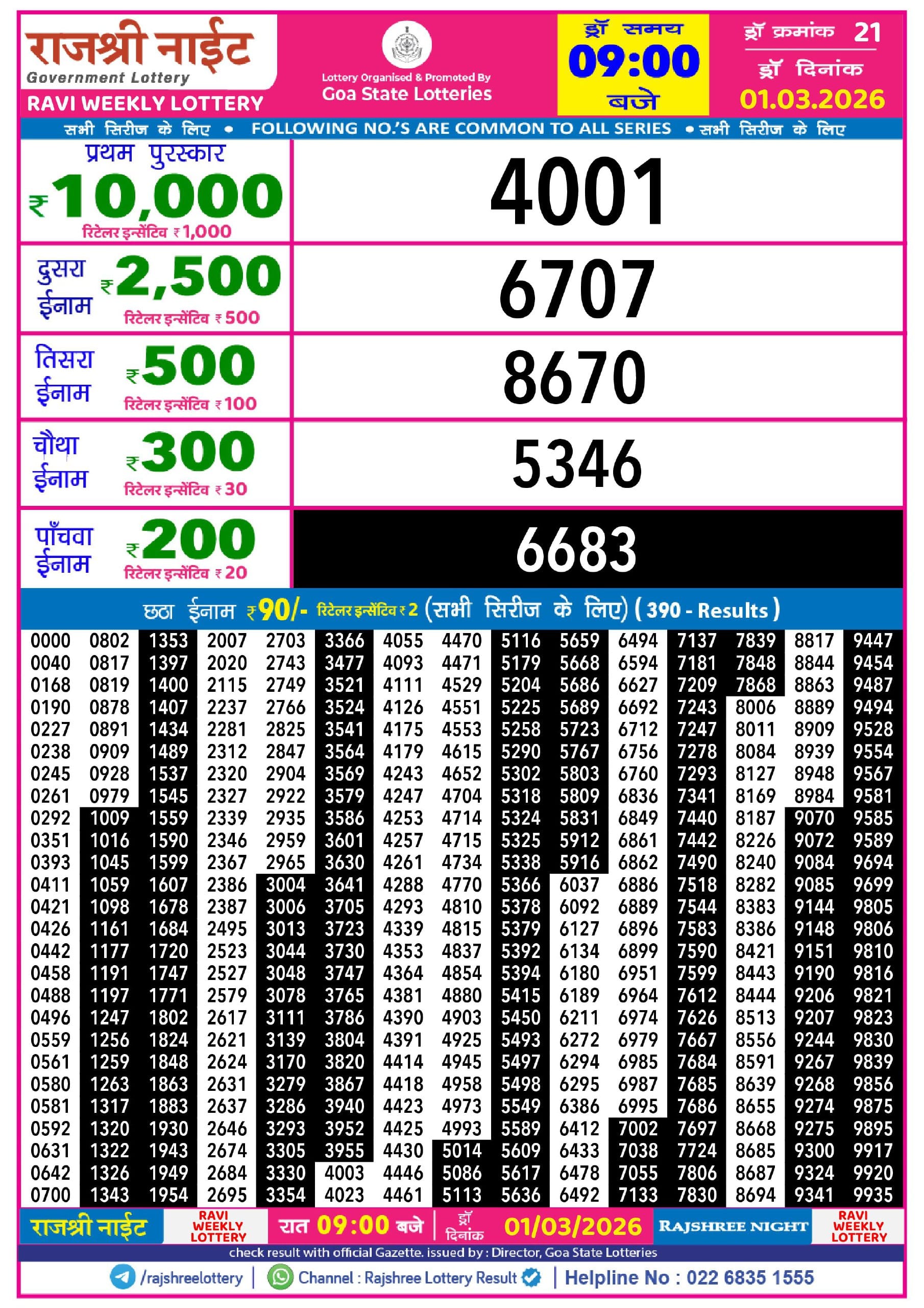 Rajshree Shani Weekly Lottery 28.2.2026 Result 2.25 PM 0 Likes 44 Views Related Articles 0 48Maharashtra Gajlaxmi Budh Weekly Draw 01.04.2026 Result 4.45 PM 0 137Maharashtra Sahyadri Prabhalaxmi Weekly Draw 08.11.2025 Result 4.30pm 0 144Rajshree 50 Lottery 7:30PM Result 16.07.2025 0 40Rajshree Night Ravi Weekly Lottery 01.03.2026 Result 9 PM