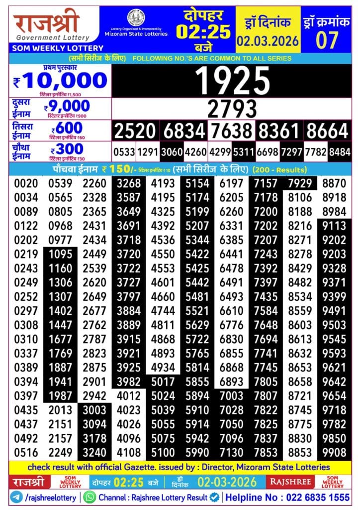 Rajshree Som Weekly Lottery 02.03.2026 Result 2.25 PM
